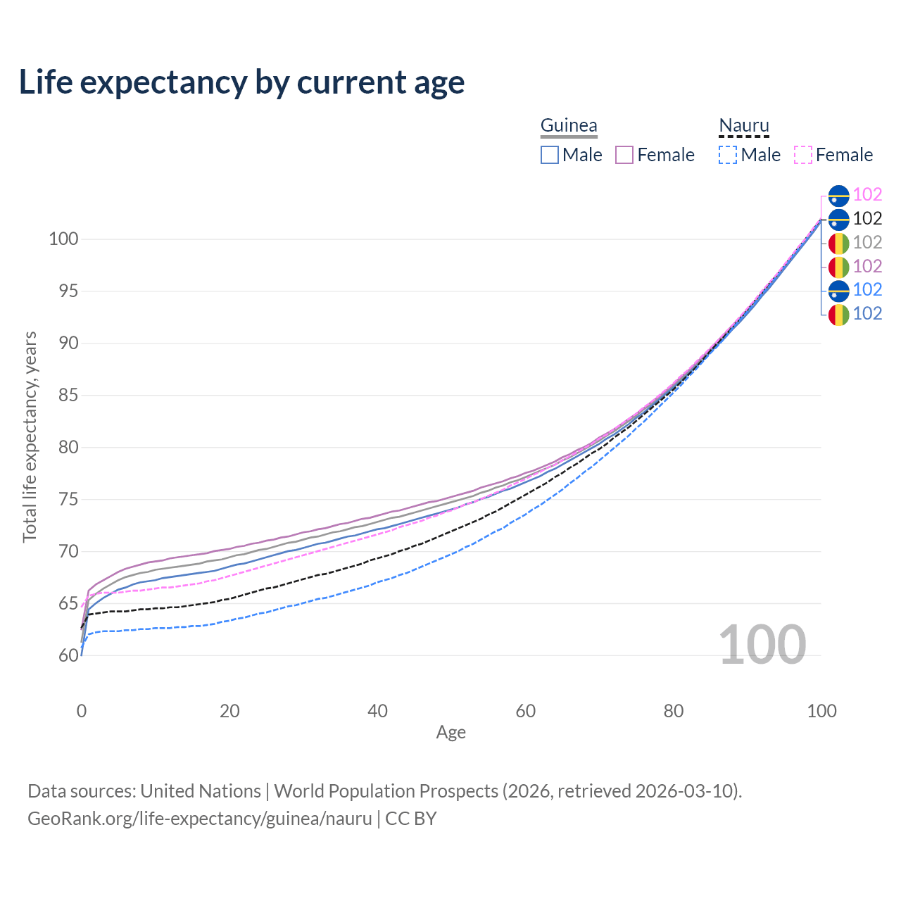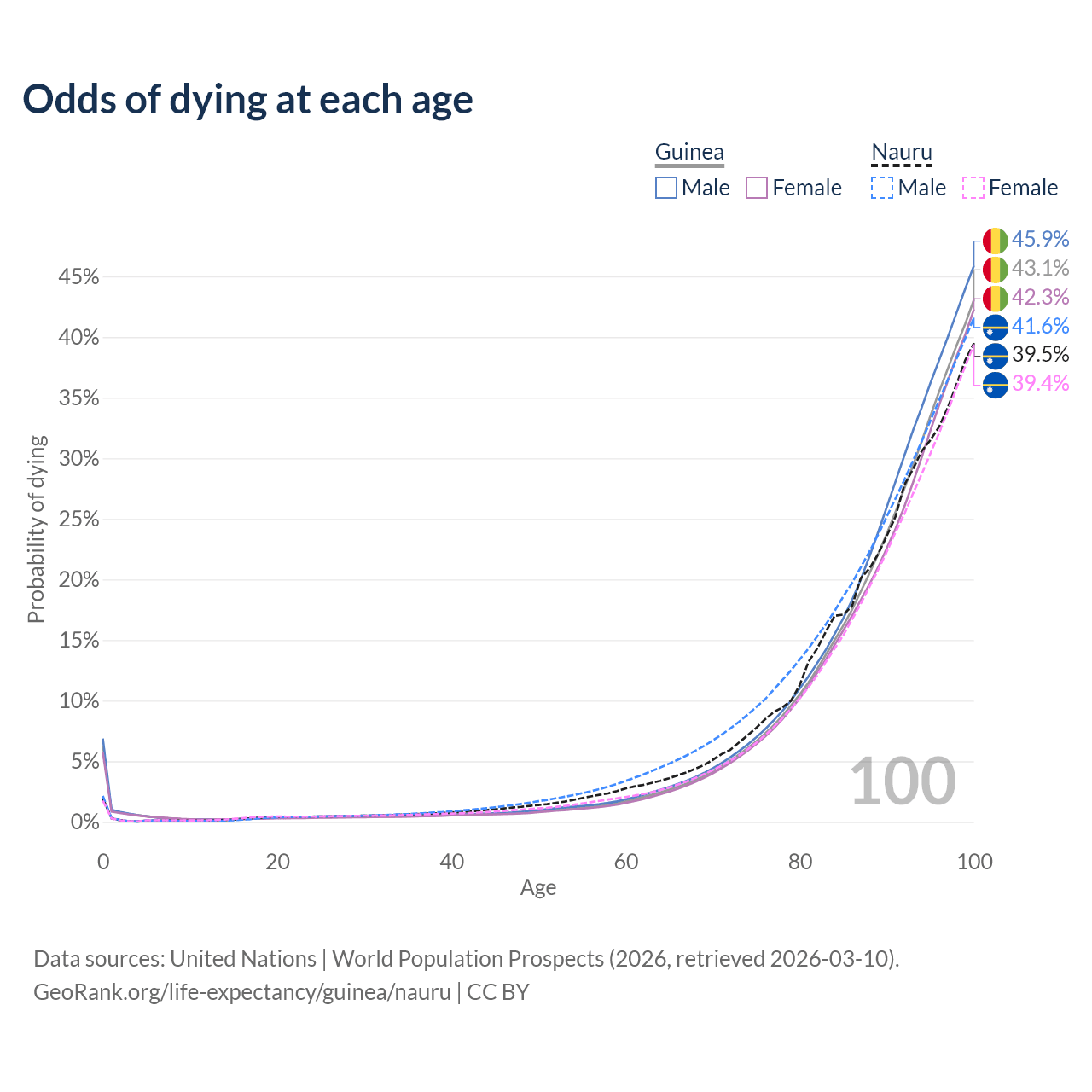 This life expectancy calculator shows the odds of living to 100, 95, 90, and below based on current age for both males and females in Guinea and Nauru, along with mean and median age of death. The calculations are based on the 2026 life tables (actuarial tables) from the UN World Population Prospects.