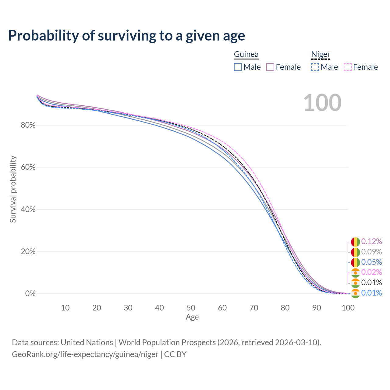 This life expectancy calculator shows the odds of living to 100, 95, 90, and below based on current age for both males and females in Guinea and Niger, along with mean and median age of death. The calculations are based on the 2026 life tables (actuarial tables) from the UN World Population Prospects.
