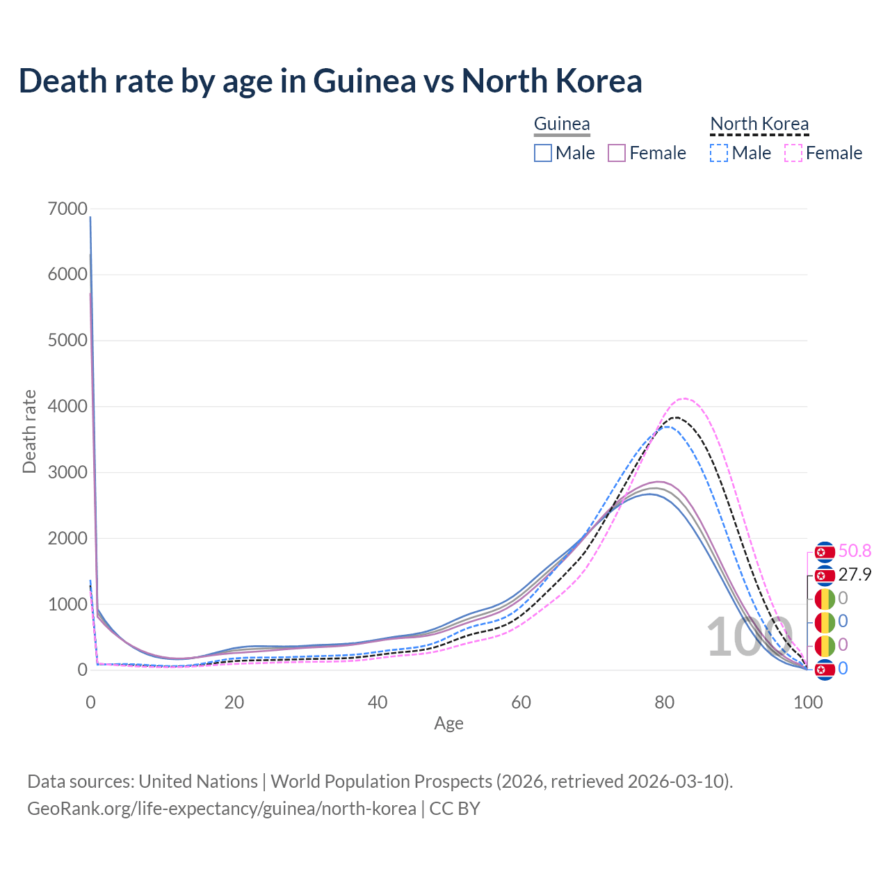 In Guinea, the most common age of death is 0, compared to 82 in North Korea. The median age of death is 70.6 in Guinea and 78.5 in North Korea, meaning only half of each cohort is expected to live past that age.