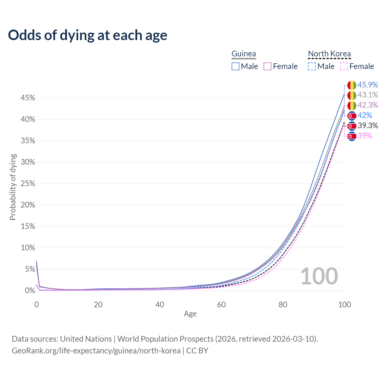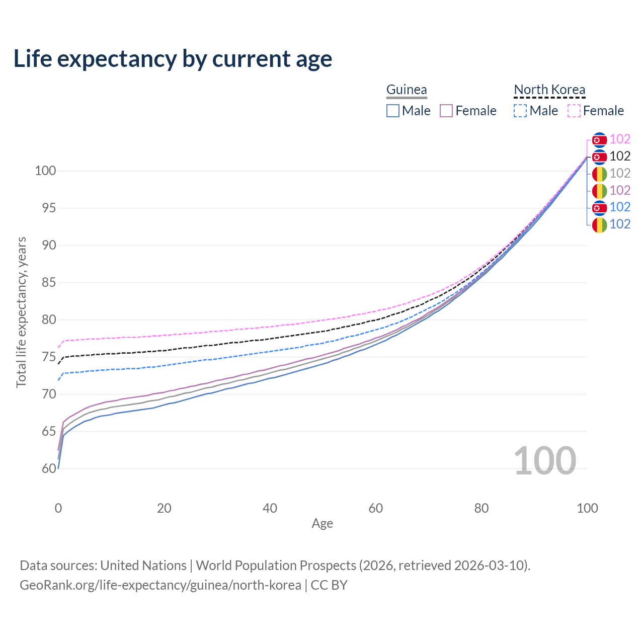 This life expectancy calculator shows the odds of living to 100, 95, 90, and below based on current age for both males and females in Guinea and North Korea, along with mean and median age of death. The calculations are based on the 2026 life tables (actuarial tables) from the UN World Population Prospects.