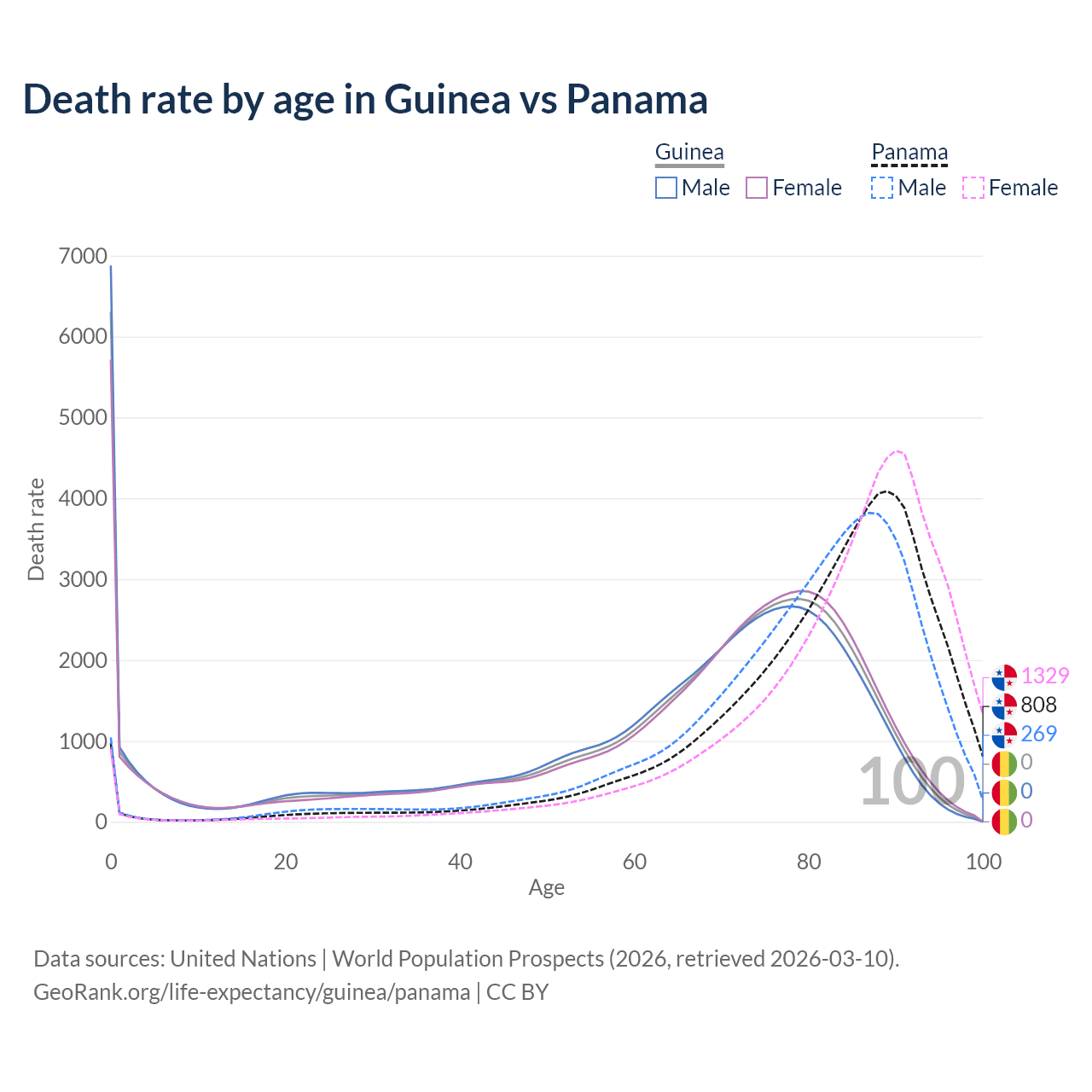 In Guinea, the most common age of death is 0, compared to 89 in Panama. The median age of death is 70.6 in Guinea and 84.6 in Panama, meaning only half of each cohort is expected to live past that age.