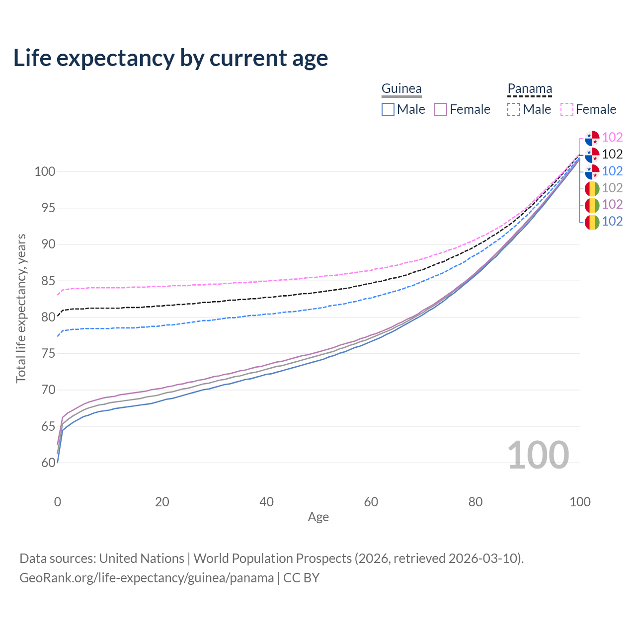 This life expectancy calculator shows the odds of living to 100, 95, 90, and below based on current age for both males and females in Guinea and Panama, along with mean and median age of death. The calculations are based on the 2026 life tables (actuarial tables) from the UN World Population Prospects.