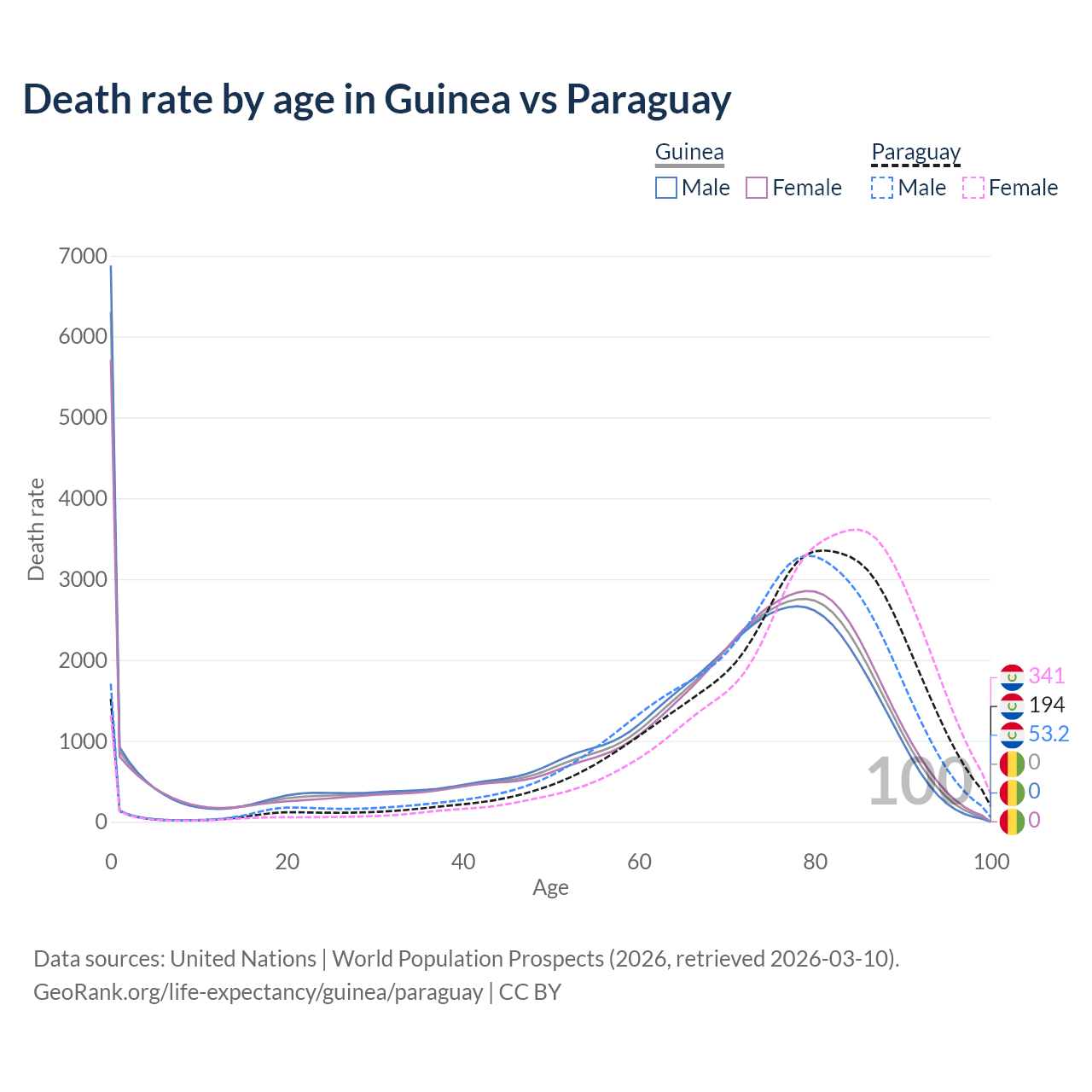 In Guinea, the most common age of death is 0, compared to 81 in Paraguay. The median age of death is 70.6 in Guinea and 78.4 in Paraguay, meaning only half of each cohort is expected to live past that age.