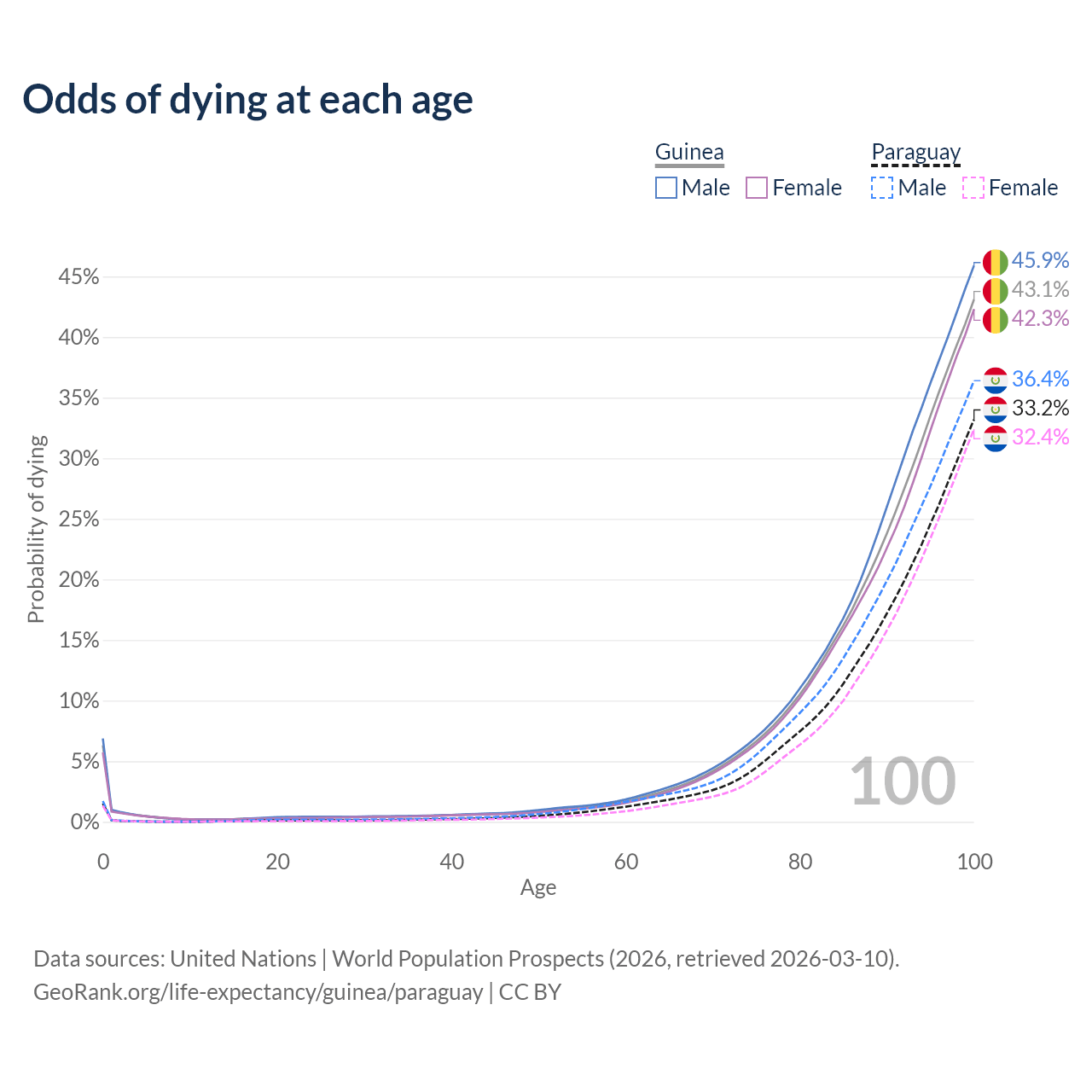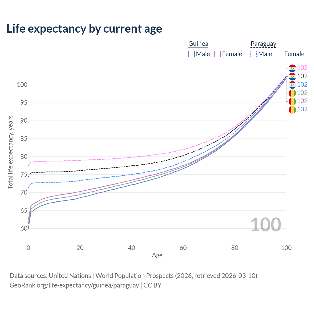 This life expectancy calculator shows the odds of living to 100, 95, 90, and below based on current age for both males and females in Guinea and Paraguay, along with mean and median age of death. The calculations are based on the 2026 life tables (actuarial tables) from the UN World Population Prospects.