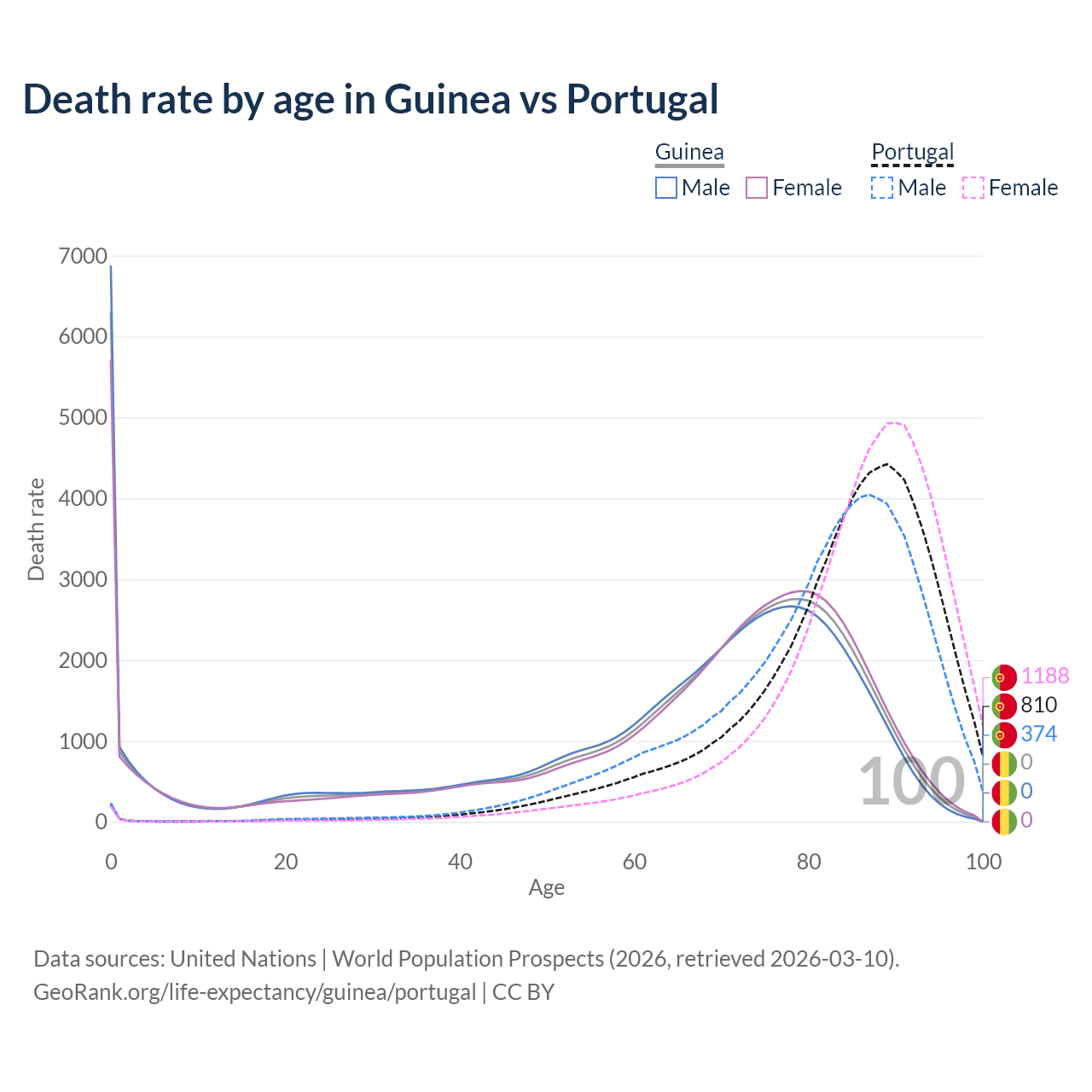 In Guinea, the most common age of death is 0, compared to 89 in Portugal. The median age of death is 70.6 in Guinea and 85.9 in Portugal, meaning only half of each cohort is expected to live past that age.
