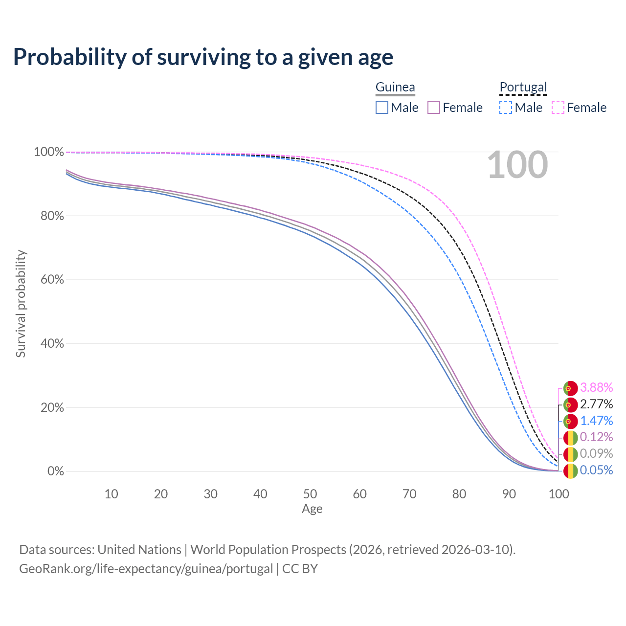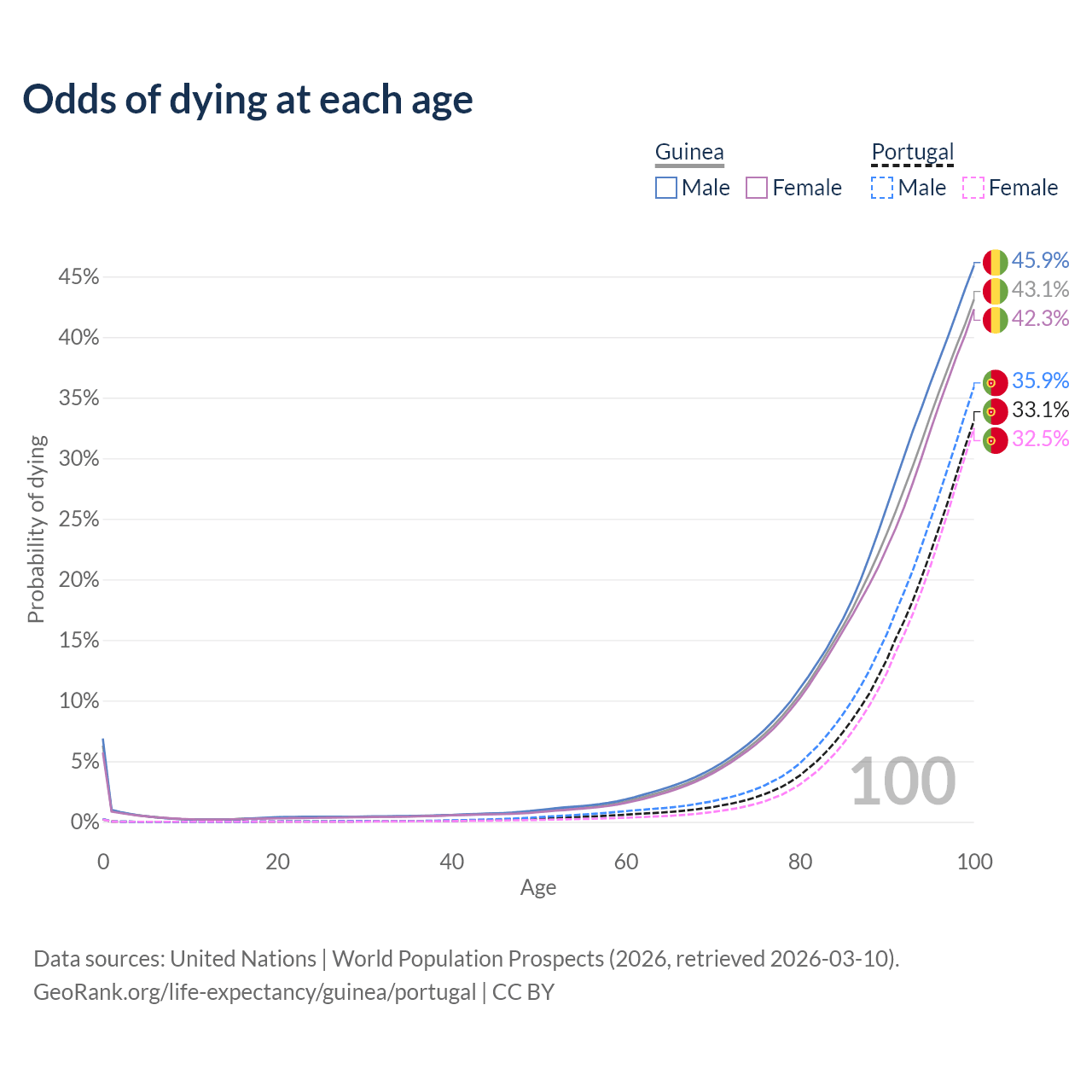 This life expectancy calculator shows the odds of living to 100, 95, 90, and below based on current age for both males and females in Guinea and Portugal, along with mean and median age of death. The calculations are based on the 2026 life tables (actuarial tables) from the UN World Population Prospects.