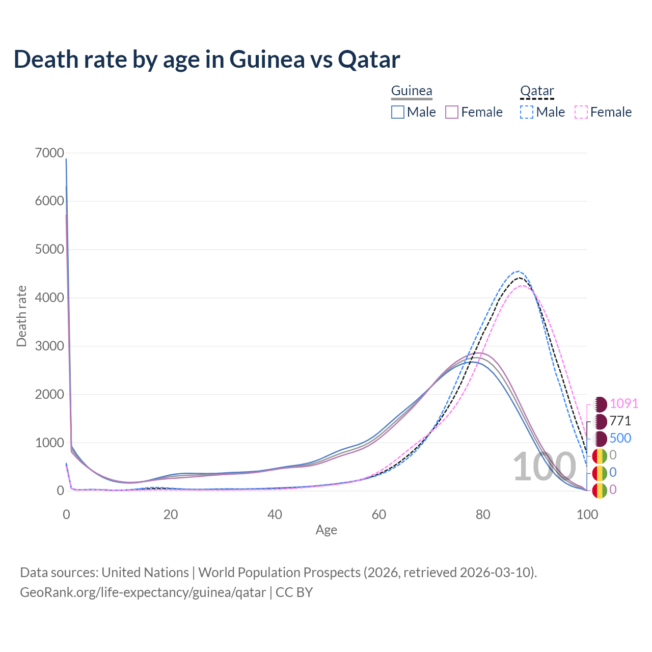 In Guinea, the most common age of death is 0, compared to 87 in Qatar. The median age of death is 70.6 in Guinea and 85.1 in Qatar, meaning only half of each cohort is expected to live past that age.
