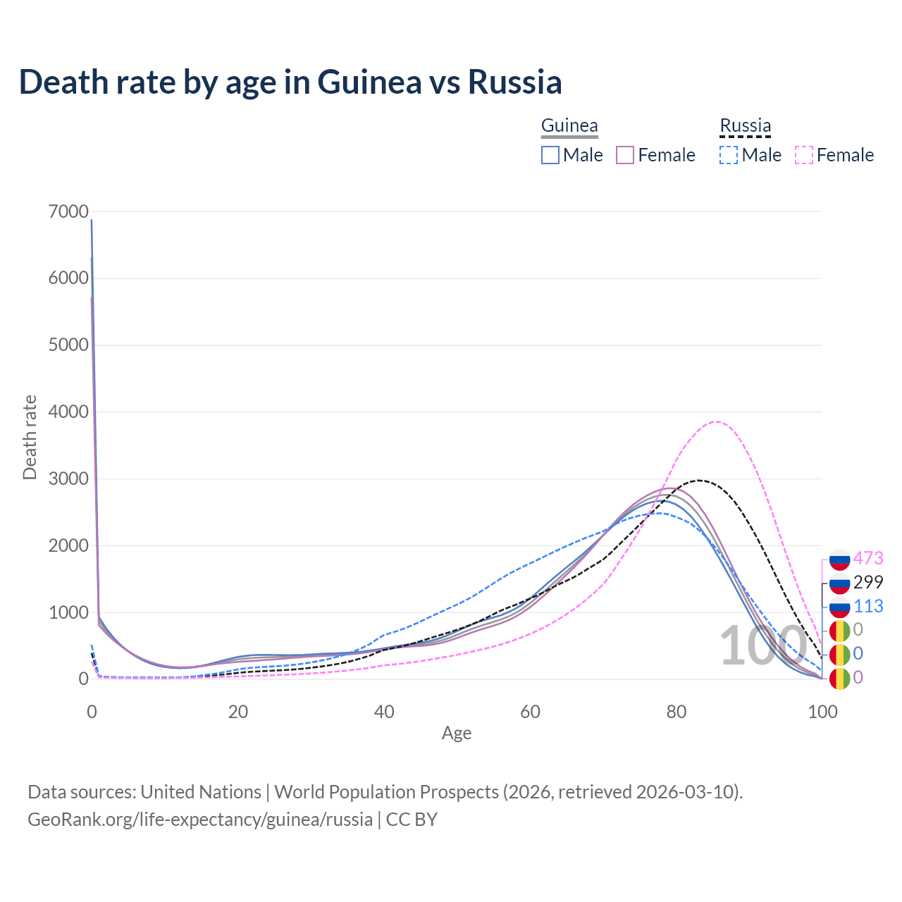 In Guinea, the most common age of death is 0, compared to 83 in Russia. The median age of death is 70.6 in Guinea and 77.5 in Russia, meaning only half of each cohort is expected to live past that age.