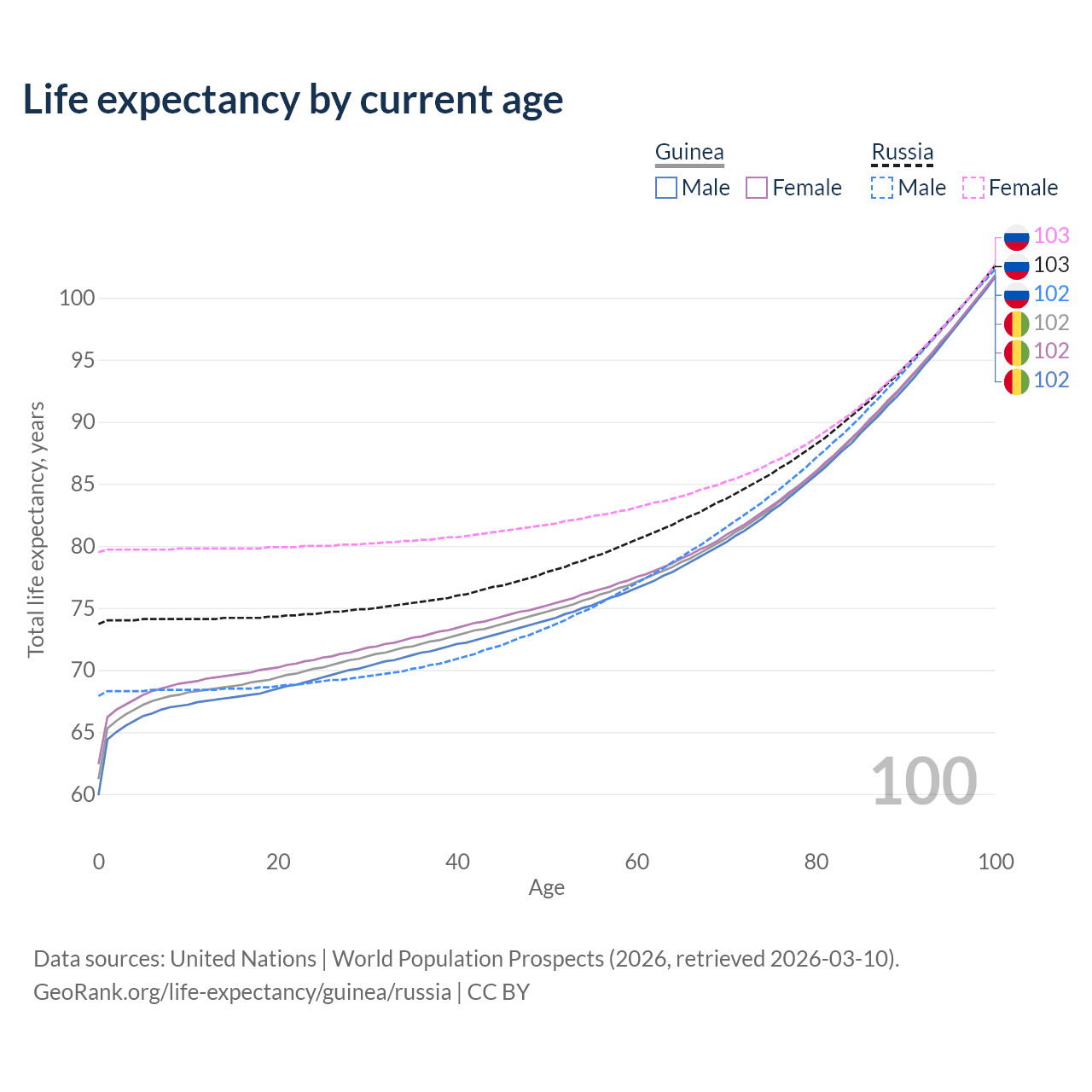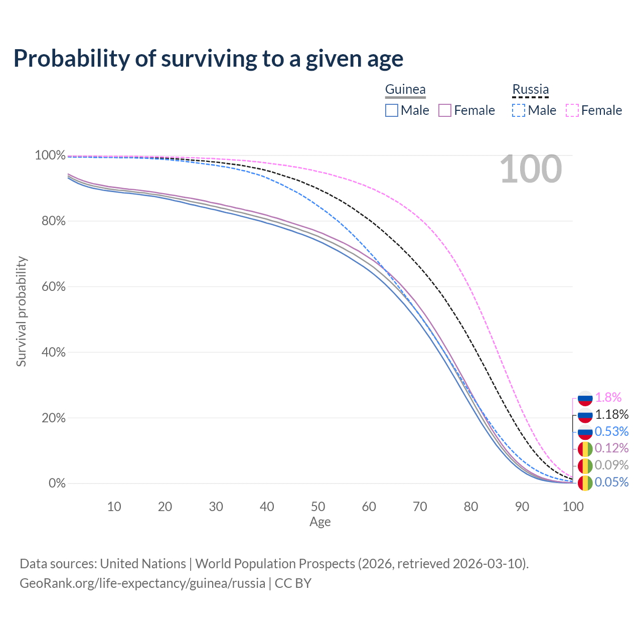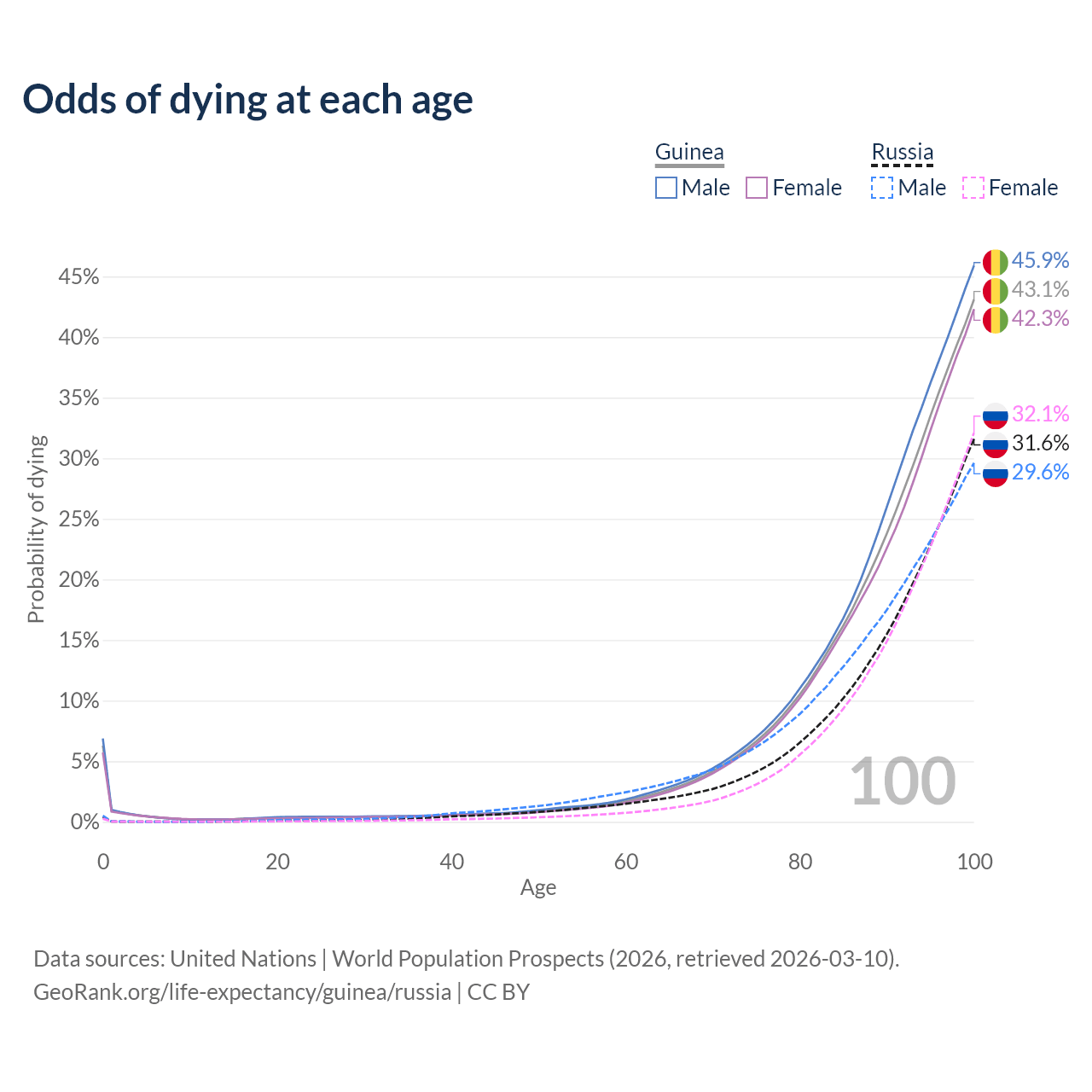 This life expectancy calculator shows the odds of living to 100, 95, 90, and below based on current age for both males and females in Guinea and Russia, along with mean and median age of death. The calculations are based on the 2026 life tables (actuarial tables) from the UN World Population Prospects.