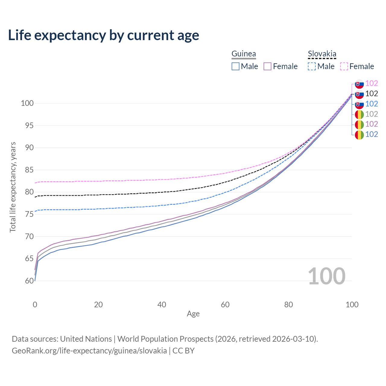 This life expectancy calculator shows the odds of living to 100, 95, 90, and below based on current age for both males and females in Guinea and Slovakia, along with mean and median age of death. The calculations are based on the 2026 life tables (actuarial tables) from the UN World Population Prospects.