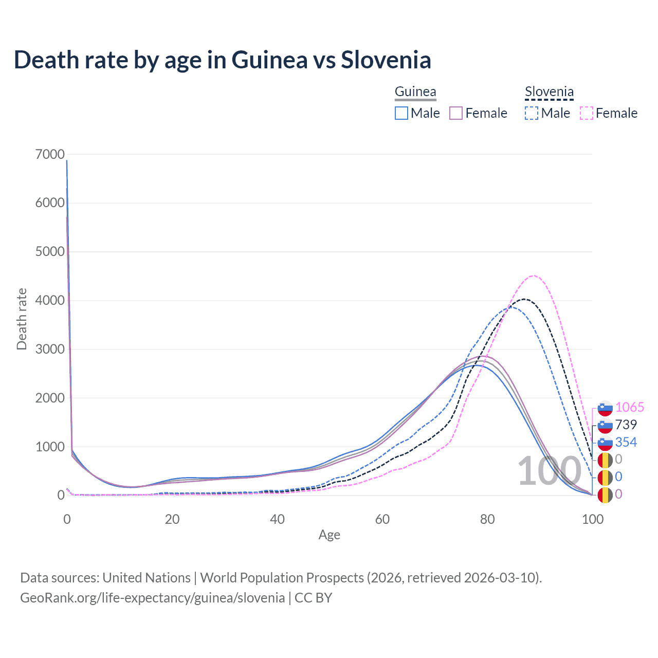 In Guinea, the most common age of death is 0, compared to 87 in Slovenia. The median age of death is 70.6 in Guinea and 84.4 in Slovenia, meaning only half of each cohort is expected to live past that age.