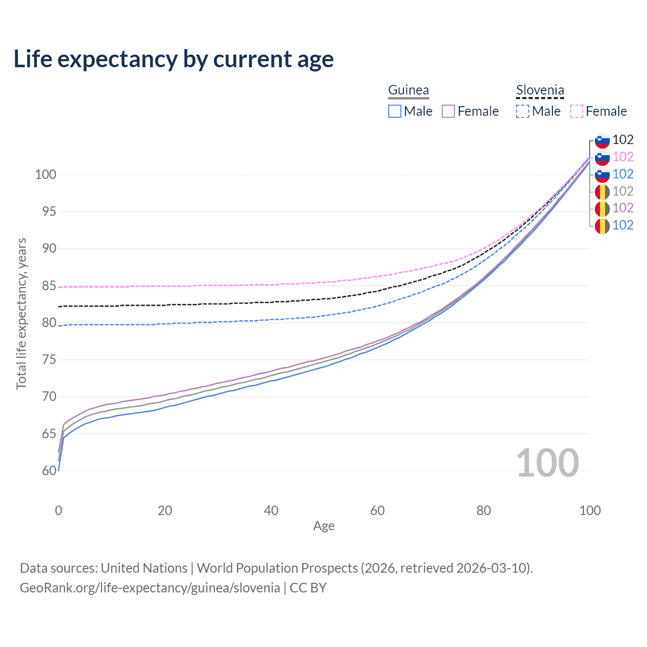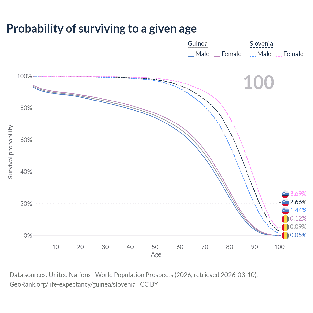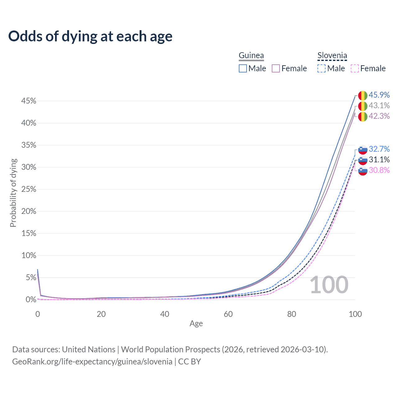 This life expectancy calculator shows the odds of living to 100, 95, 90, and below based on current age for both males and females in Guinea and Slovenia, along with mean and median age of death. The calculations are based on the 2026 life tables (actuarial tables) from the UN World Population Prospects.