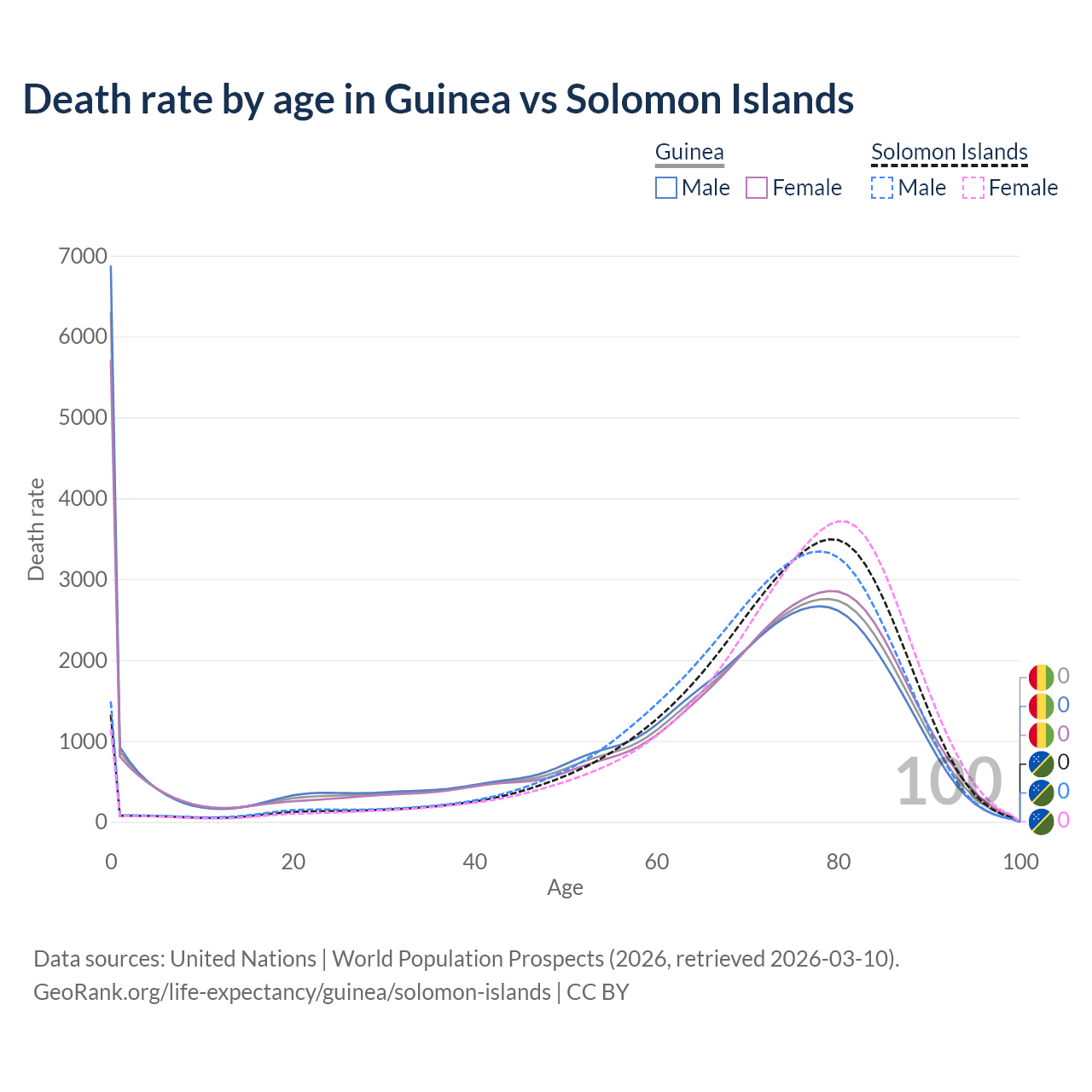 In Guinea, the most common age of death is 0, compared to 79 in the Solomon Islands. The median age of death is 70.6 in Guinea and 74.9 in the Solomon Islands, meaning only half of each cohort is expected to live past that age.