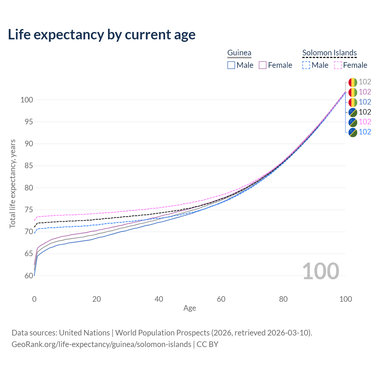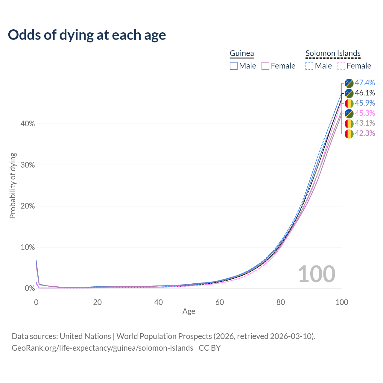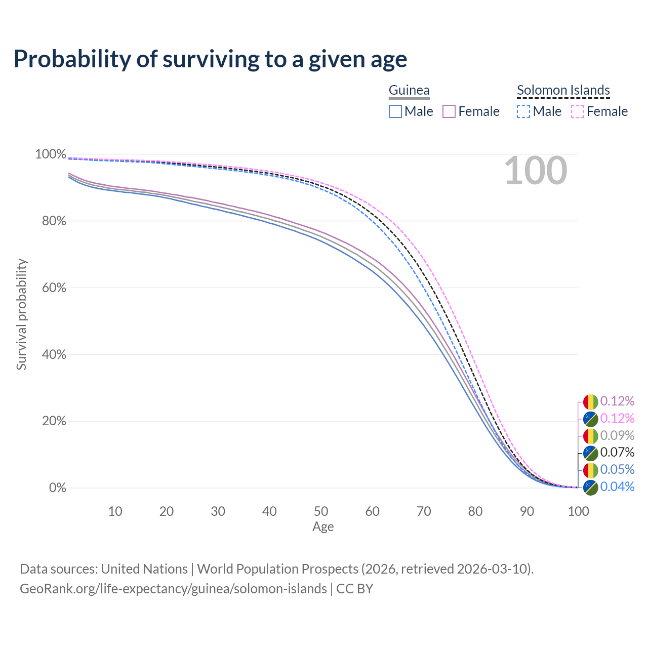 This life expectancy calculator shows the odds of living to 100, 95, 90, and below based on current age for both males and females in Guinea and the Solomon Islands, along with mean and median age of death. The calculations are based on the 2026 life tables (actuarial tables) from the UN World Population Prospects.