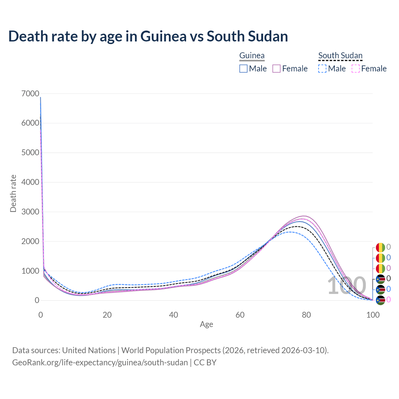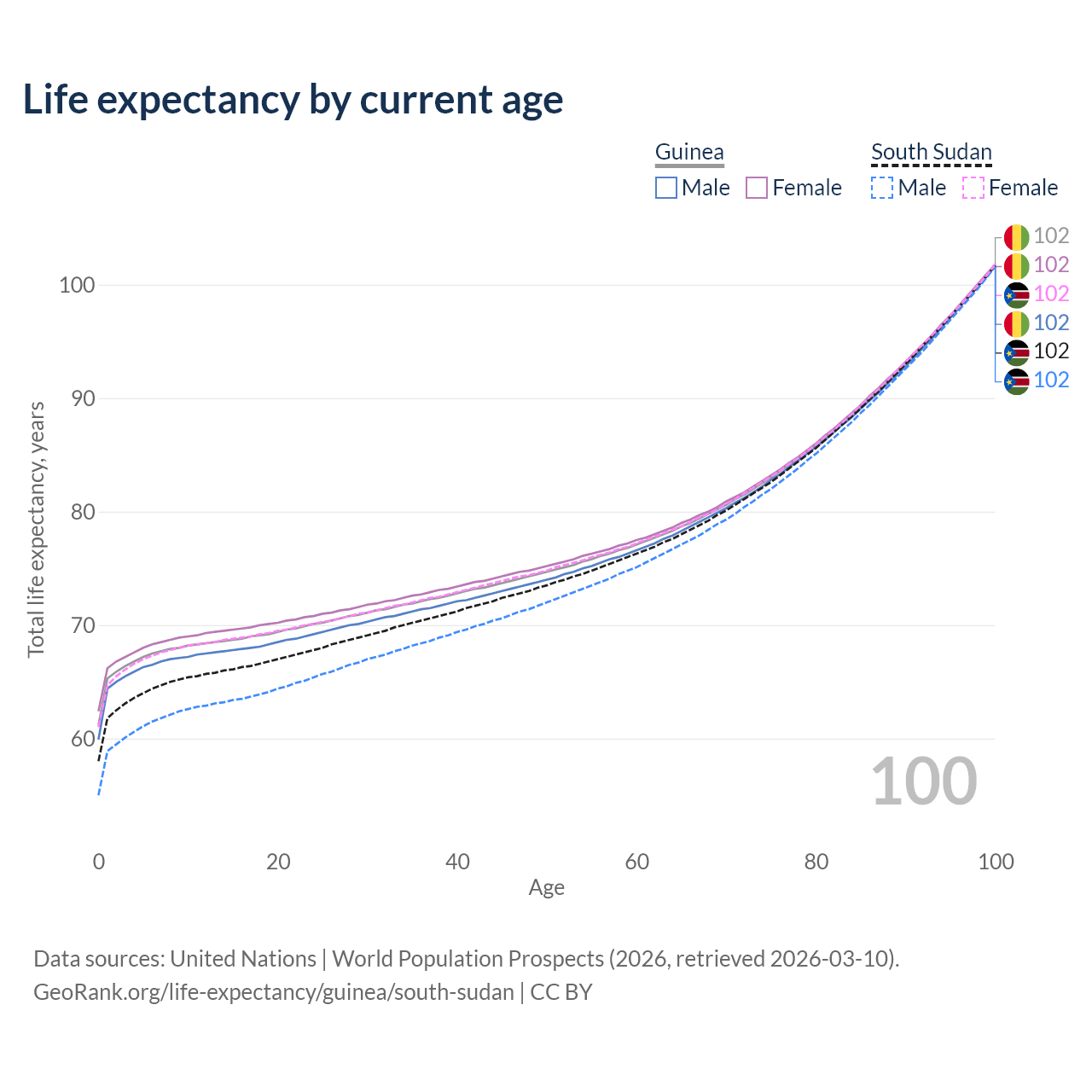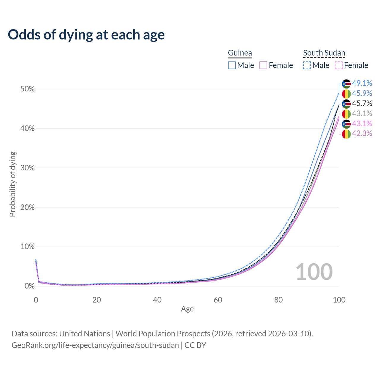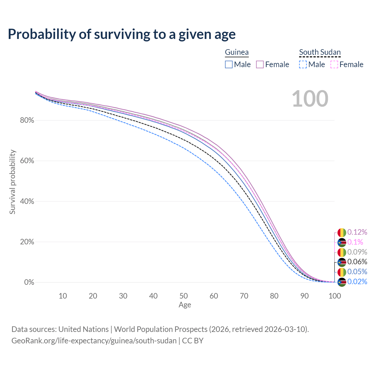 This life expectancy calculator shows the odds of living to 100, 95, 90, and below based on current age for both males and females in Guinea and South Sudan, along with mean and median age of death. The calculations are based on the 2026 life tables (actuarial tables) from the UN World Population Prospects.