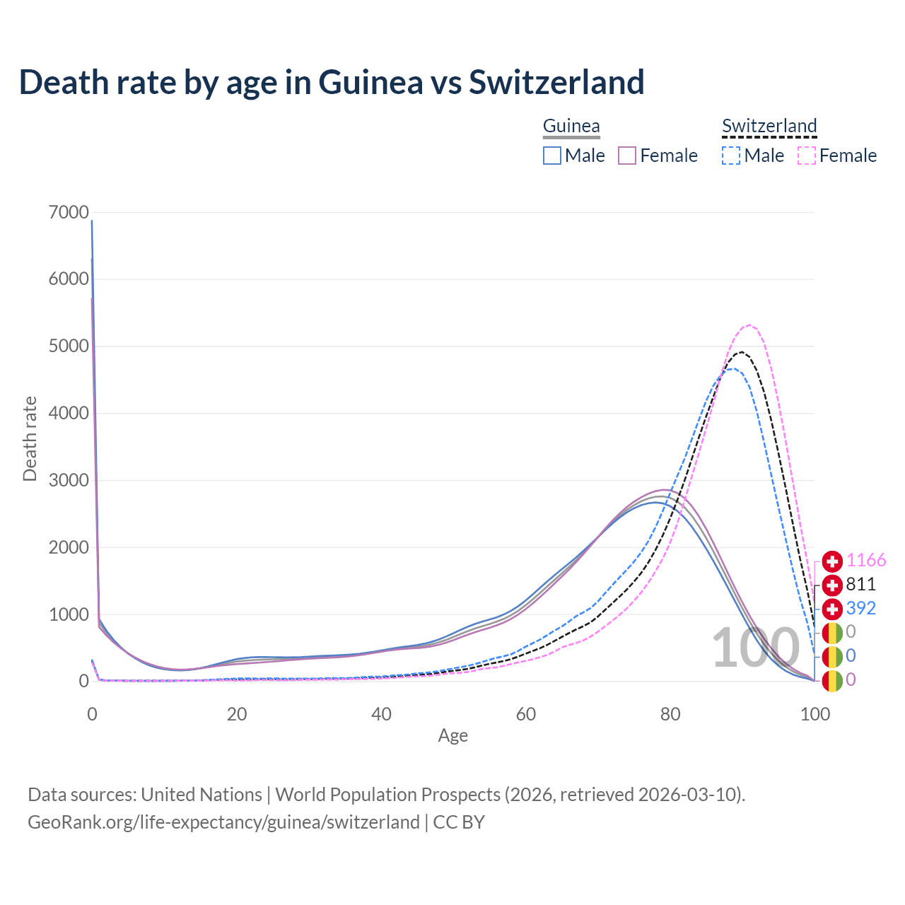 In Guinea, the most common age of death is 0, compared to 90 in Switzerland. The median age of death is 70.6 in Guinea and 87.2 in Switzerland, meaning only half of each cohort is expected to live past that age.