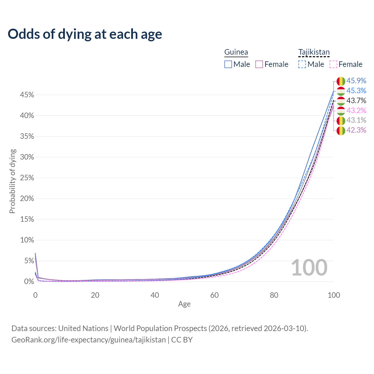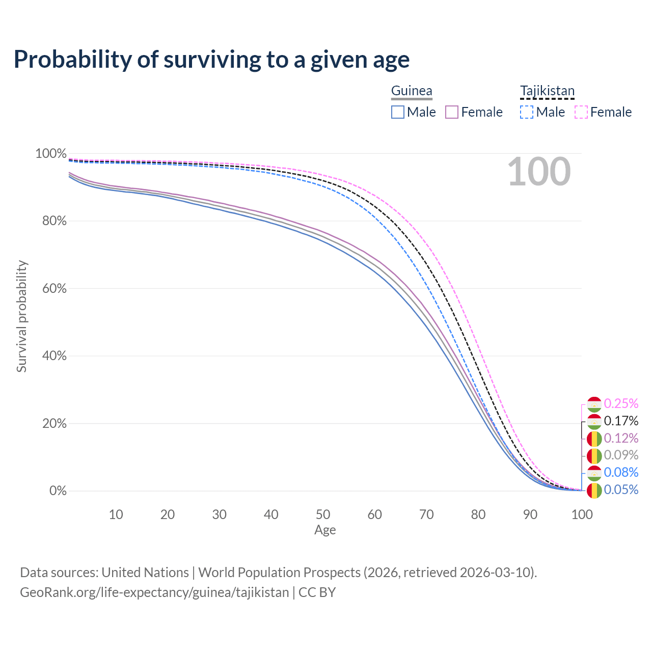 This life expectancy calculator shows the odds of living to 100, 95, 90, and below based on current age for both males and females in Guinea and Tajikistan, along with mean and median age of death. The calculations are based on the 2026 life tables (actuarial tables) from the UN World Population Prospects.