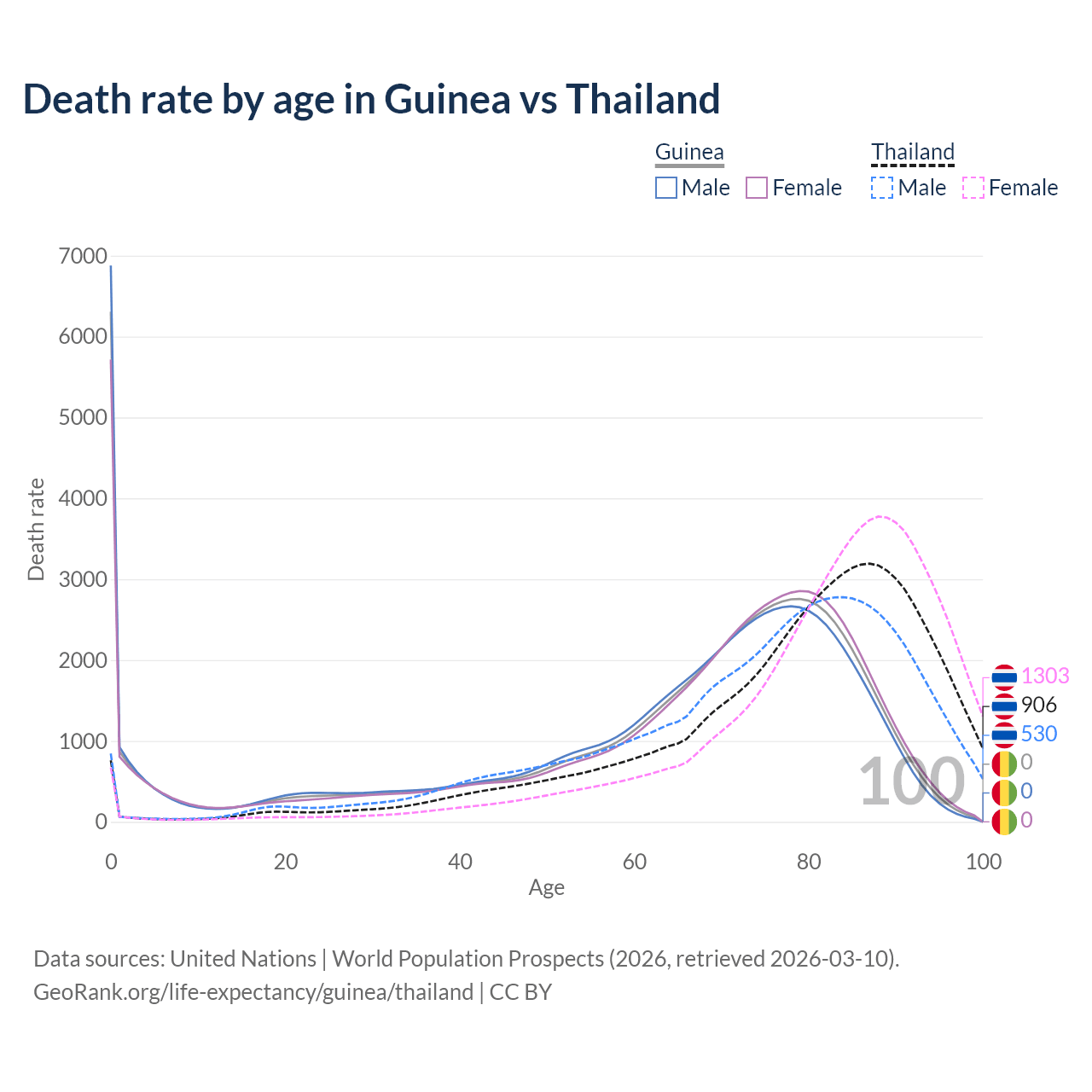 In Guinea, the most common age of death is 0, compared to 87 in Thailand. The median age of death is 70.6 in Guinea and 81.8 in Thailand, meaning only half of each cohort is expected to live past that age.