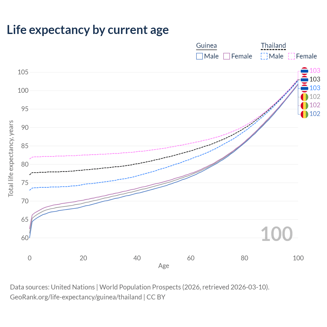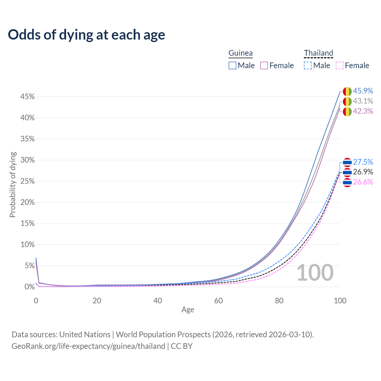 This life expectancy calculator shows the odds of living to 100, 95, 90, and below based on current age for both males and females in Guinea and Thailand, along with mean and median age of death. The calculations are based on the 2026 life tables (actuarial tables) from the UN World Population Prospects.