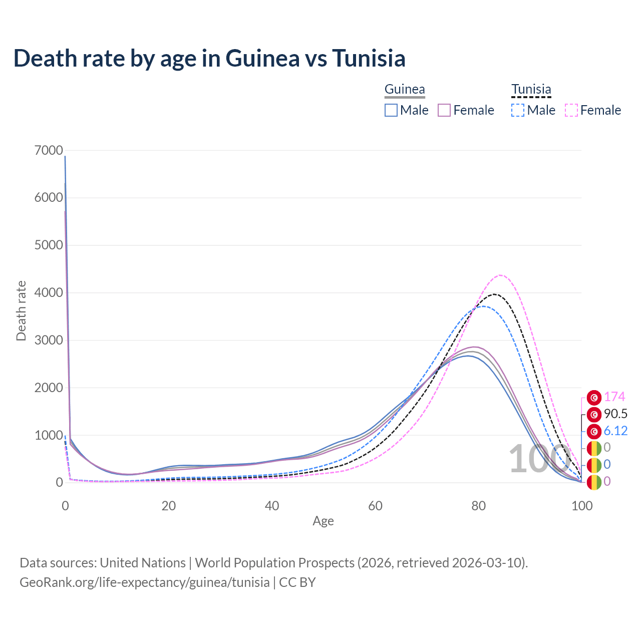 In Guinea, the most common age of death is 0, compared to 83 in Tunisia. The median age of death is 70.6 in Guinea and 80.2 in Tunisia, meaning only half of each cohort is expected to live past that age.
