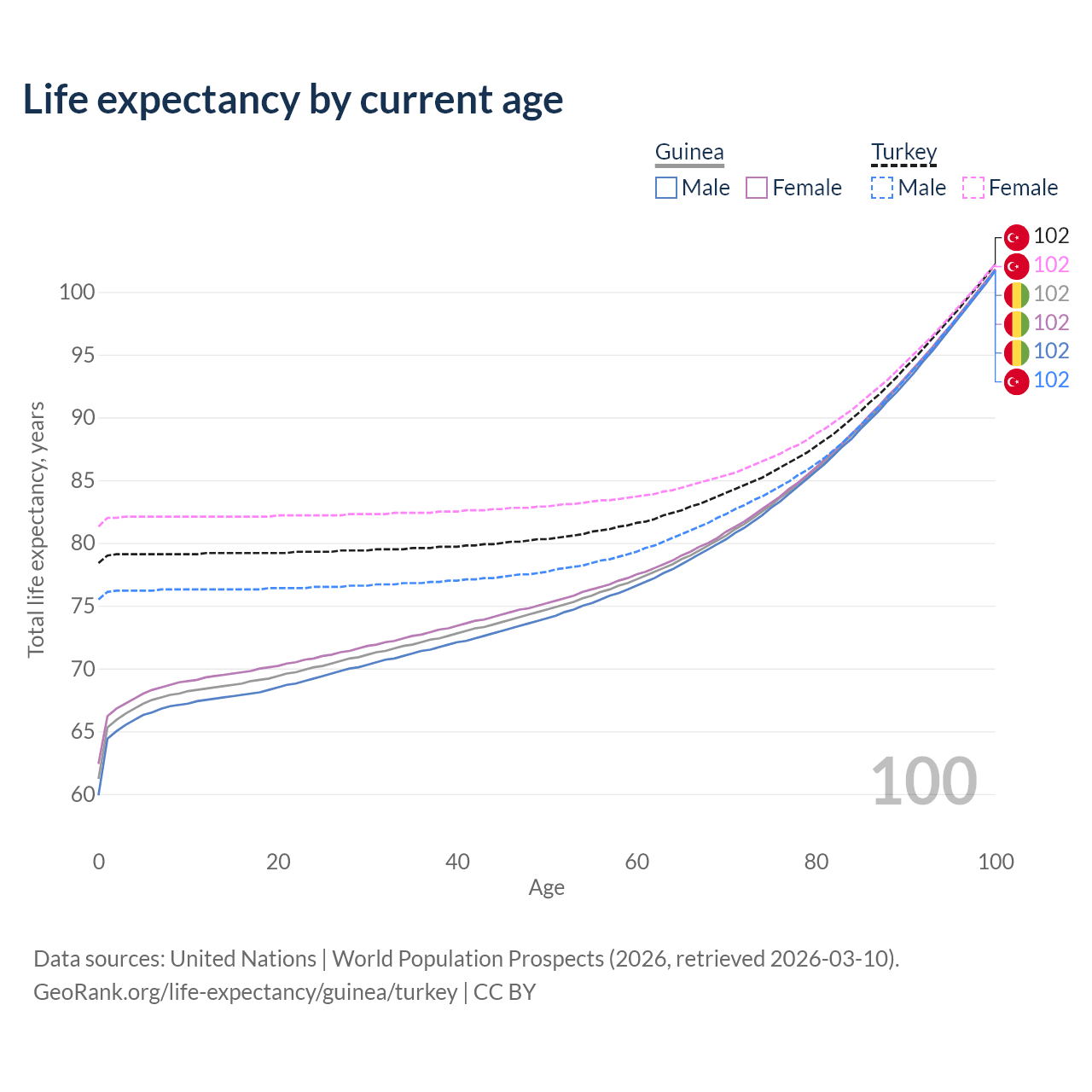 This life expectancy calculator shows the odds of living to 100, 95, 90, and below based on current age for both males and females in Guinea and Turkey, along with mean and median age of death. The calculations are based on the 2026 life tables (actuarial tables) from the UN World Population Prospects.