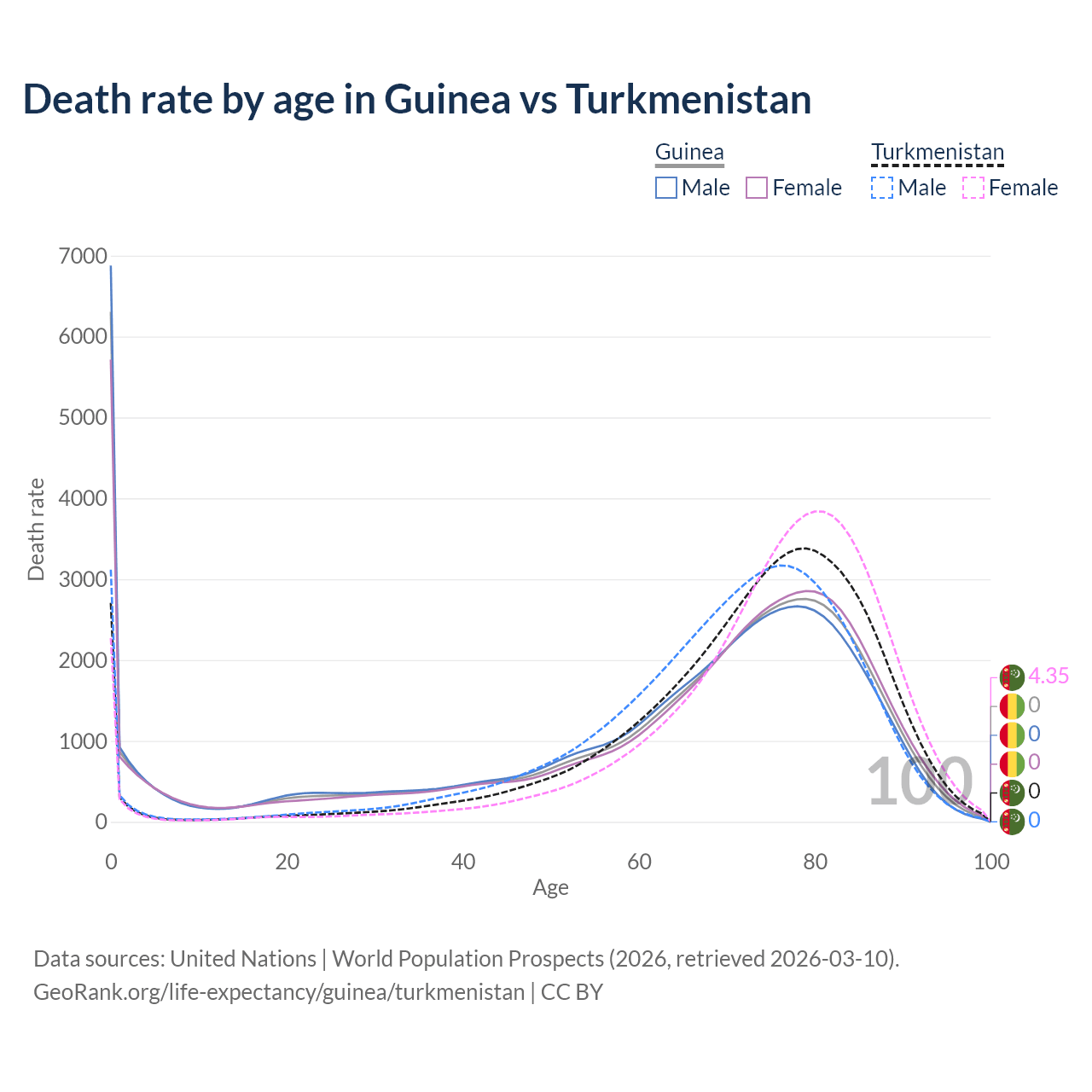 In Guinea, the most common age of death is 0, compared to 79 in Turkmenistan. The median age of death is 70.6 in Guinea and 75.1 in Turkmenistan, meaning only half of each cohort is expected to live past that age.