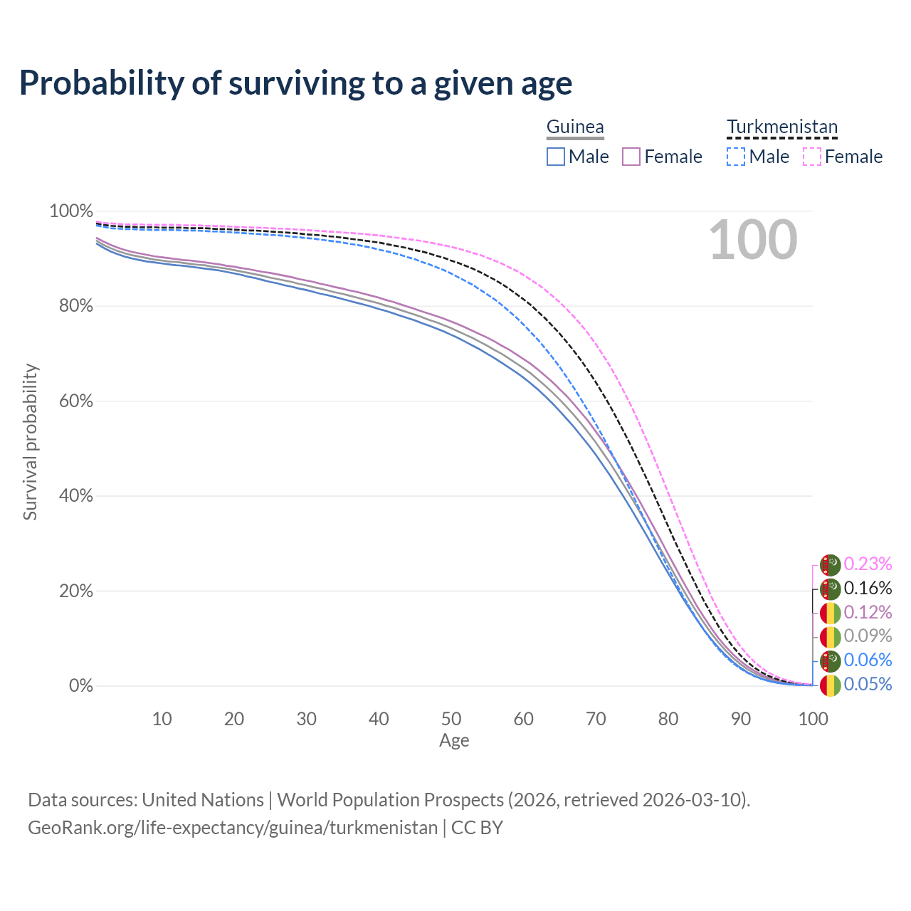 This life expectancy calculator shows the odds of living to 100, 95, 90, and below based on current age for both males and females in Guinea and Turkmenistan, along with mean and median age of death. The calculations are based on the 2026 life tables (actuarial tables) from the UN World Population Prospects.