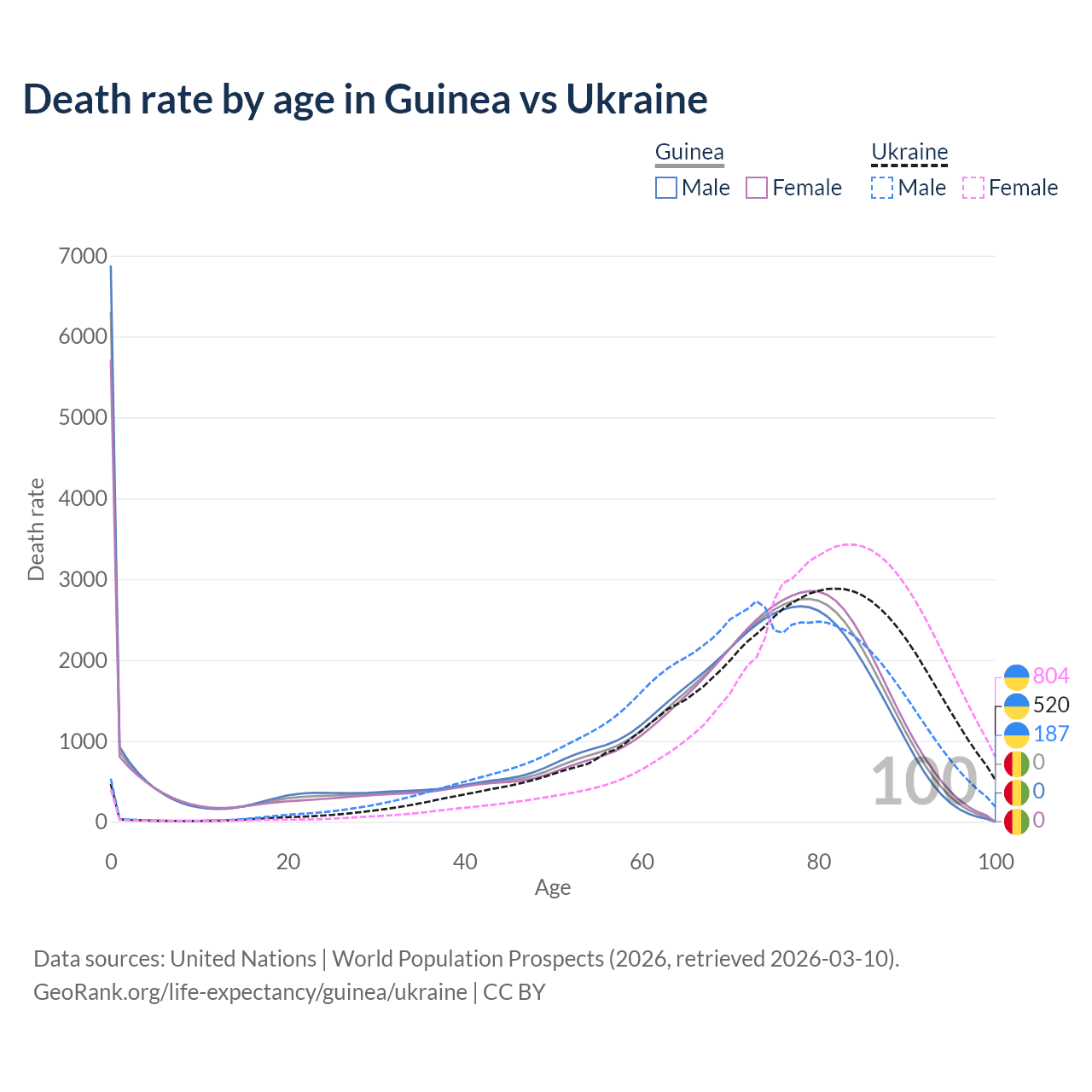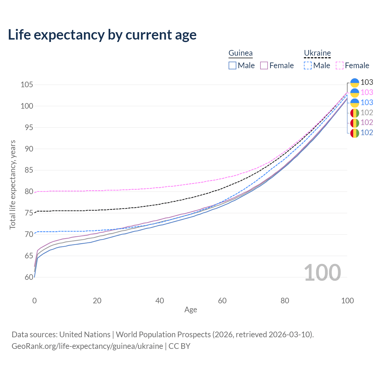 This life expectancy calculator shows the odds of living to 100, 95, 90, and below based on current age for both males and females in Guinea and Ukraine, along with mean and median age of death. The calculations are based on the 2026 life tables (actuarial tables) from the UN World Population Prospects.