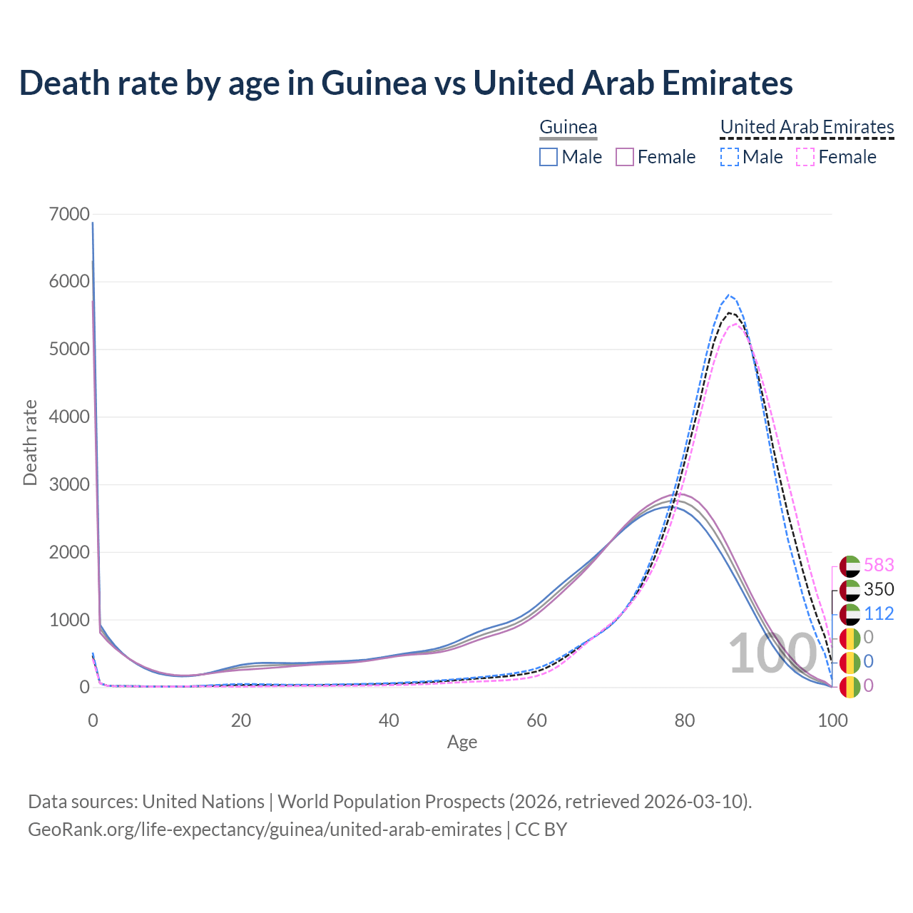 In Guinea, the most common age of death is 0, compared to 86 in the United Arab Emirates. The median age of death is 70.6 in Guinea and 85.6 in the United Arab Emirates, meaning only half of each cohort is expected to live past that age.