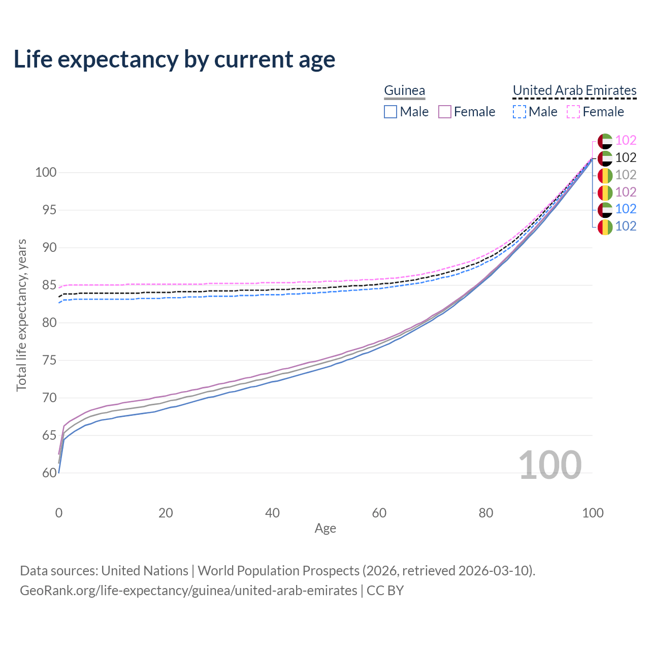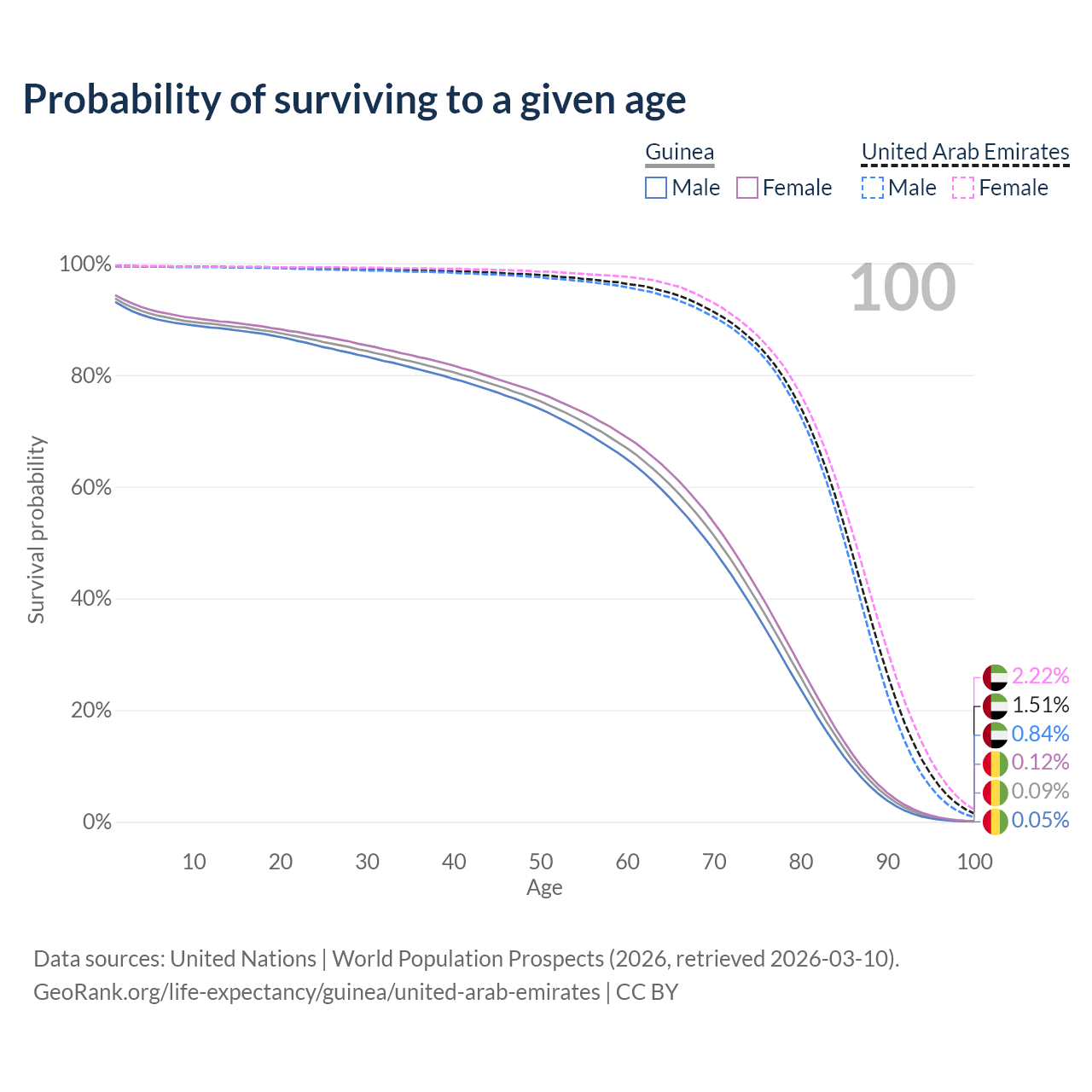 This life expectancy calculator shows the odds of living to 100, 95, 90, and below based on current age for both males and females in Guinea and the United Arab Emirates, along with mean and median age of death. The calculations are based on the 2026 life tables (actuarial tables) from the UN World Population Prospects.