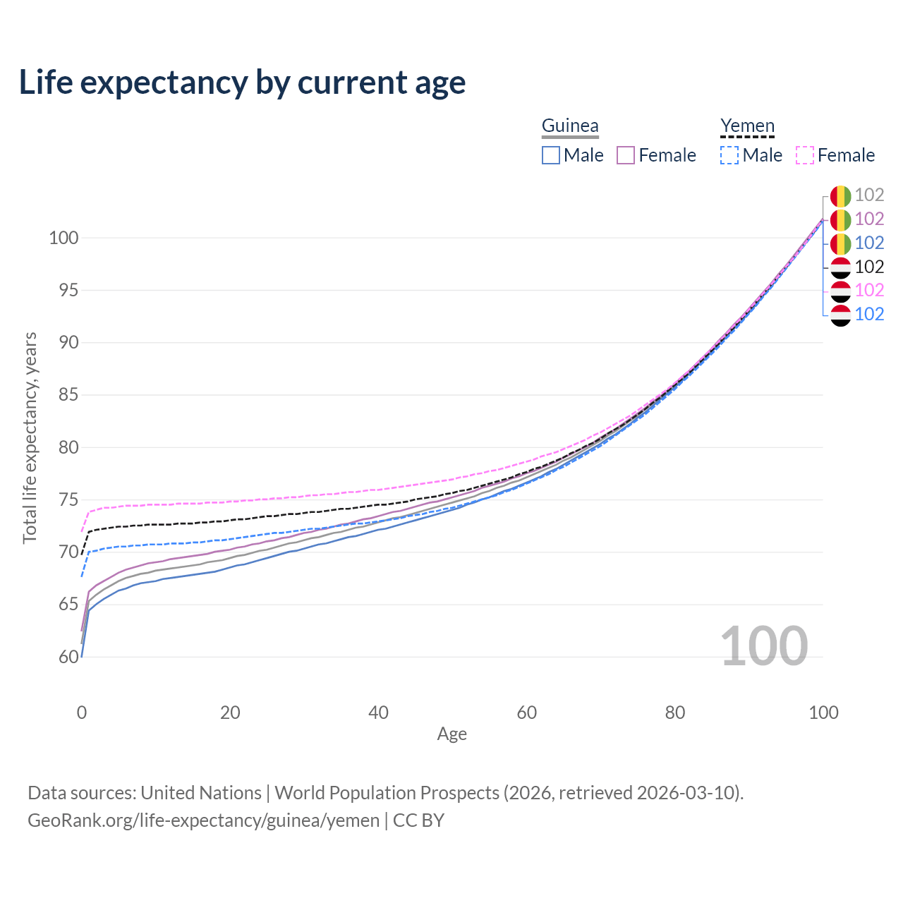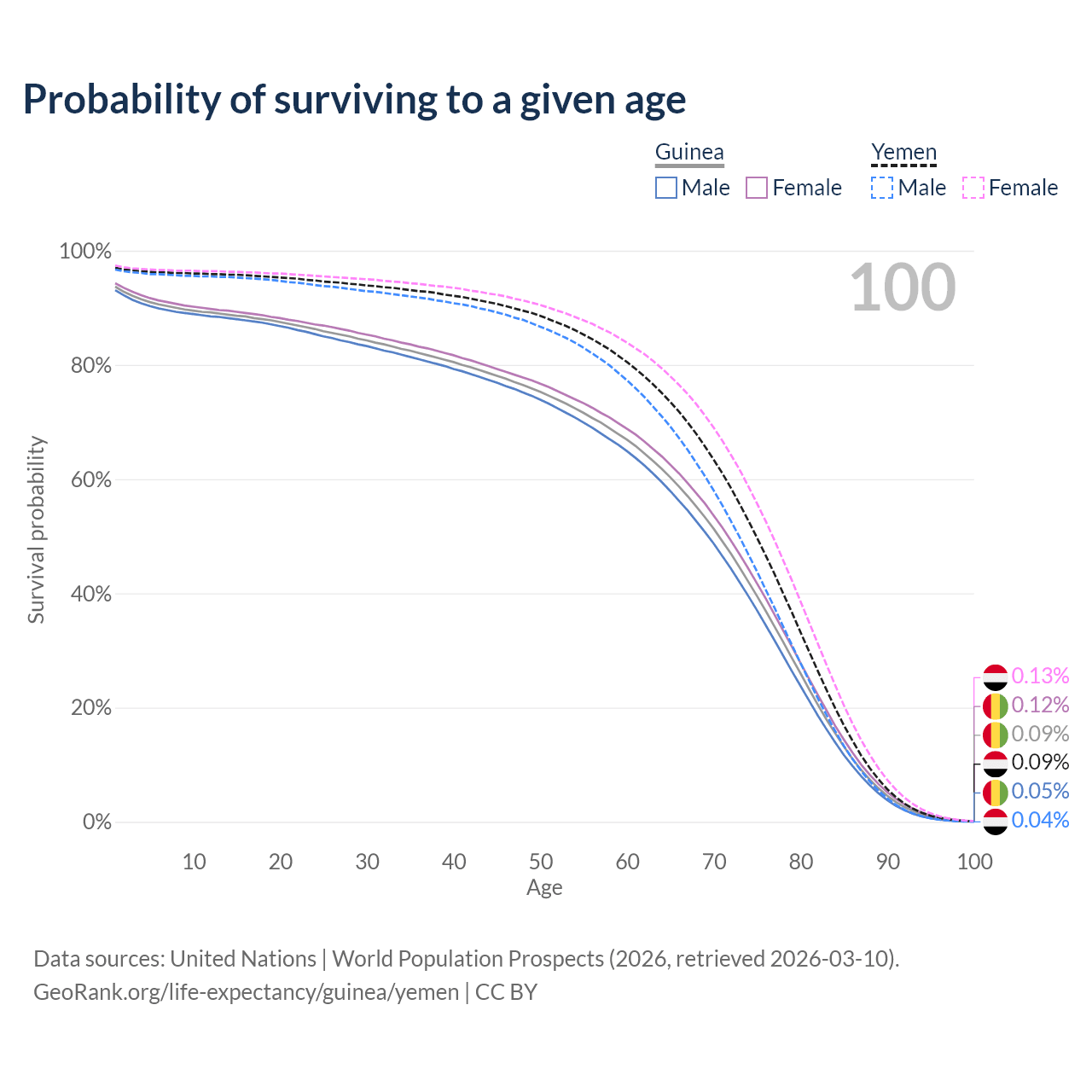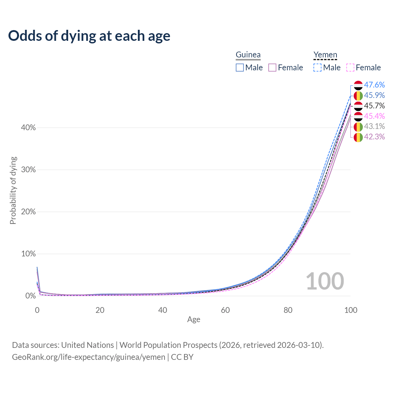 This life expectancy calculator shows the odds of living to 100, 95, 90, and below based on current age for both males and females in Guinea and Yemen, along with mean and median age of death. The calculations are based on the 2026 life tables (actuarial tables) from the UN World Population Prospects.