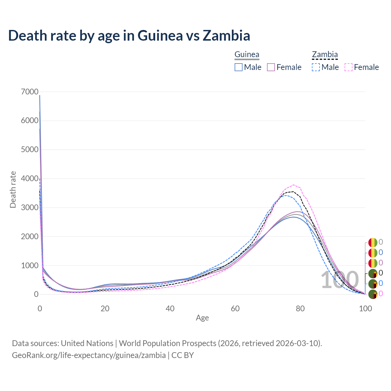 In Guinea, the most common age of death is 0, compared to 0 in Zambia. The median age of death is 70.6 in Guinea and 73.1 in Zambia, meaning only half of each cohort is expected to live past that age.