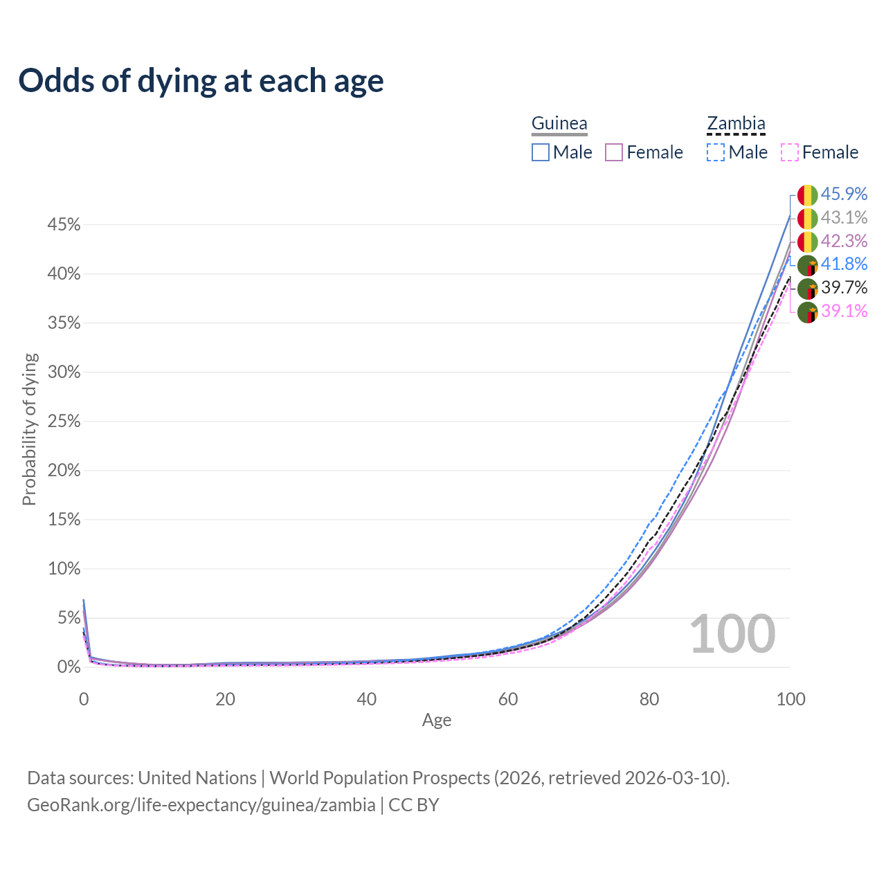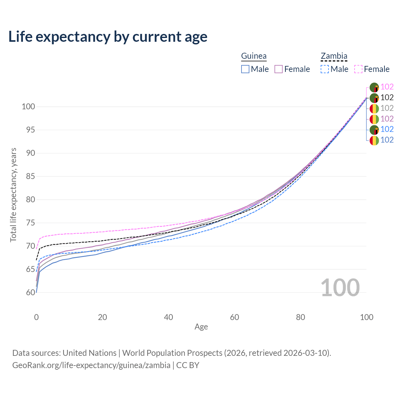 This life expectancy calculator shows the odds of living to 100, 95, 90, and below based on current age for both males and females in Guinea and Zambia, along with mean and median age of death. The calculations are based on the 2026 life tables (actuarial tables) from the UN World Population Prospects.