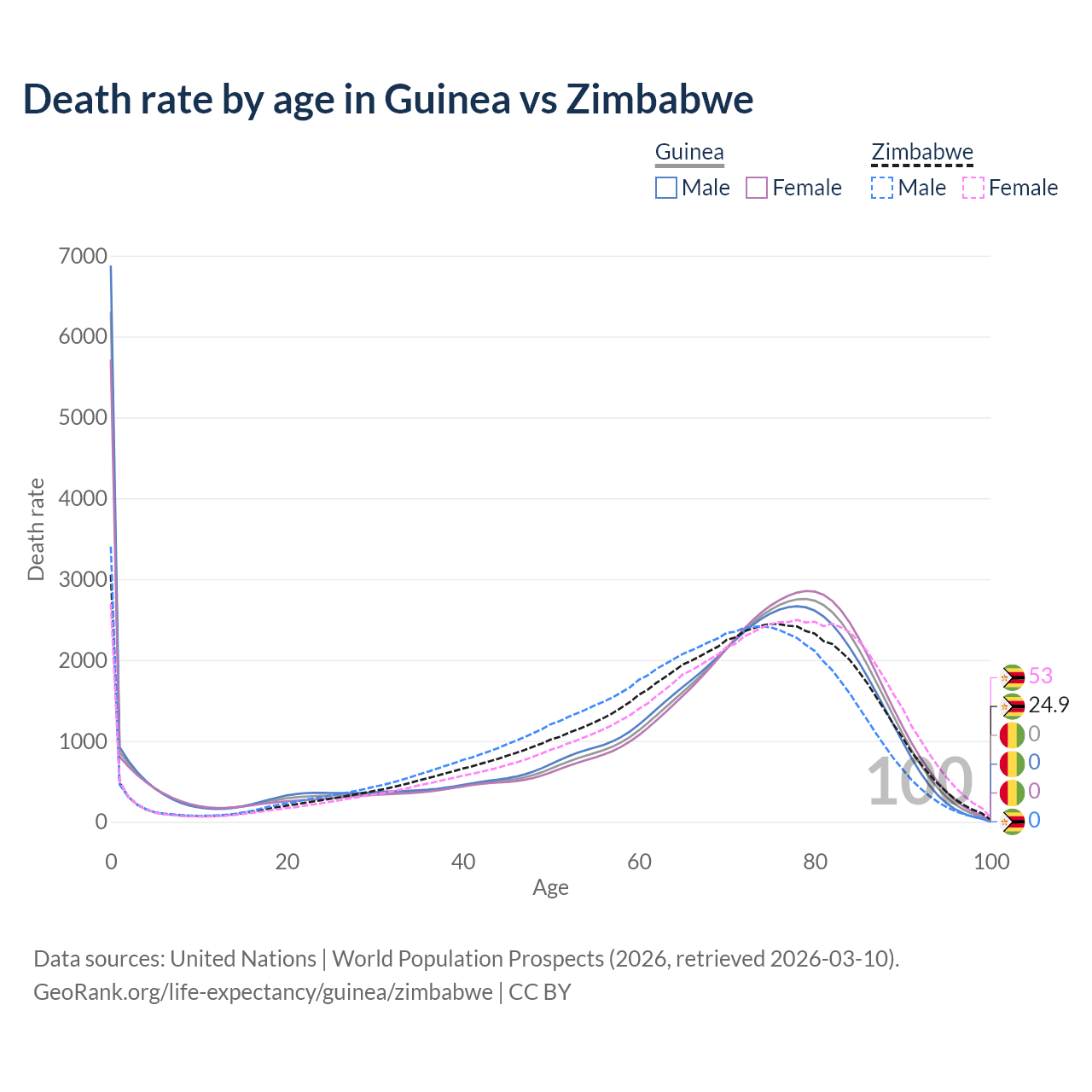 In Guinea, the most common age of death is 0, compared to 0 in Zimbabwe. The median age of death is 70.6 in Guinea and 68.8 in Zimbabwe, meaning only half of each cohort is expected to live past that age.