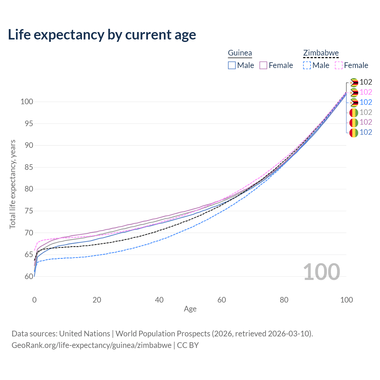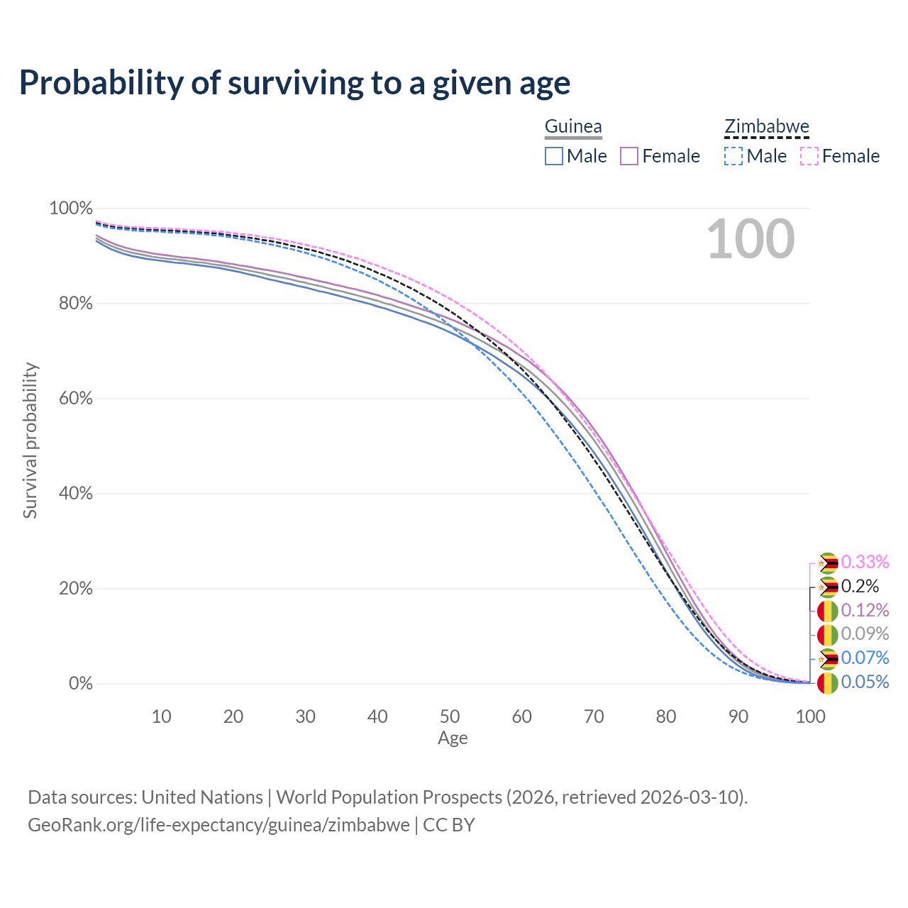 This life expectancy calculator shows the odds of living to 100, 95, 90, and below based on current age for both males and females in Guinea and Zimbabwe, along with mean and median age of death. The calculations are based on the 2026 life tables (actuarial tables) from the UN World Population Prospects.