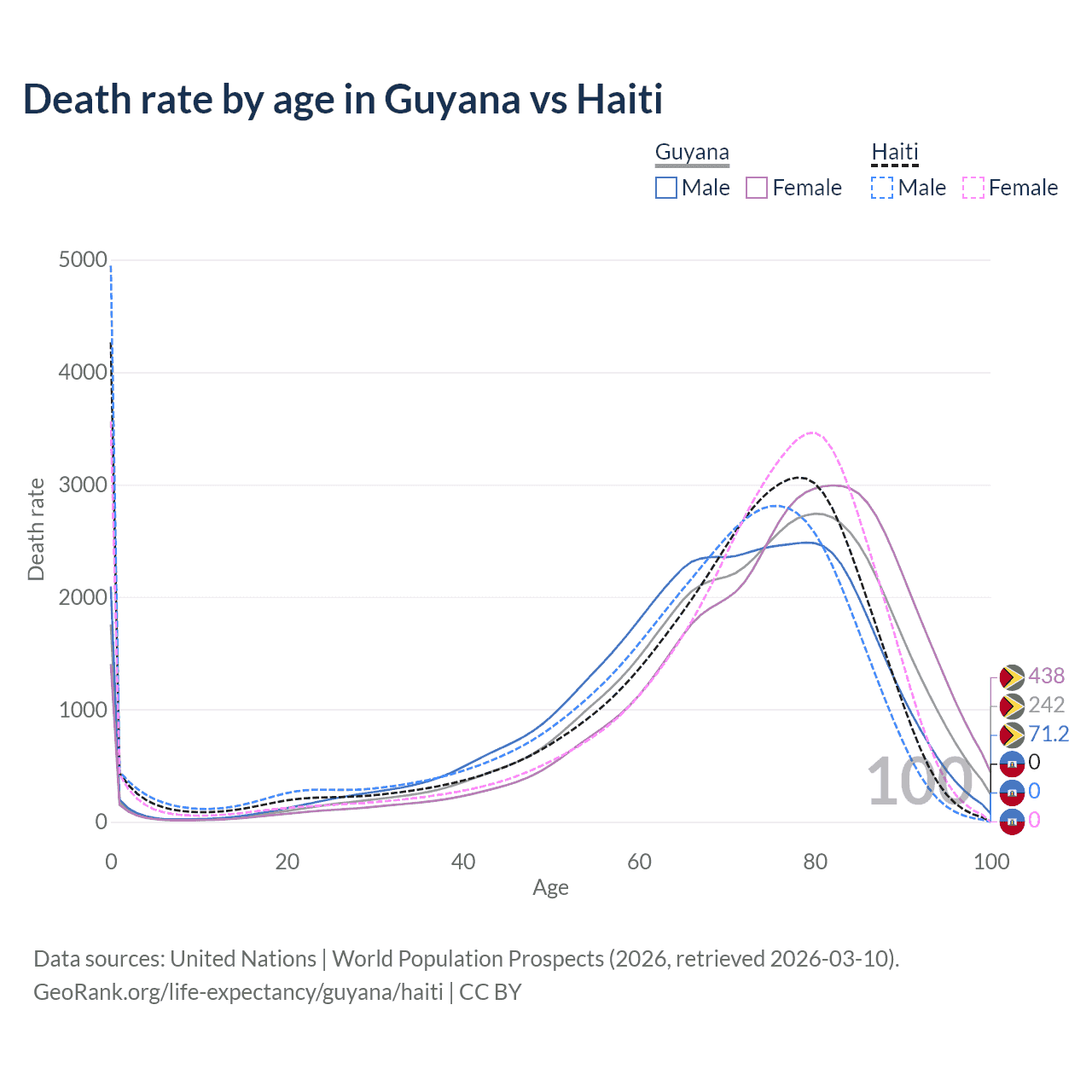 In Guyana, the most common age of death is 80, compared to 0 in Haiti. The median age of death is 74.1 in Guyana and 72 in Haiti, meaning only half of each cohort is expected to live past that age.