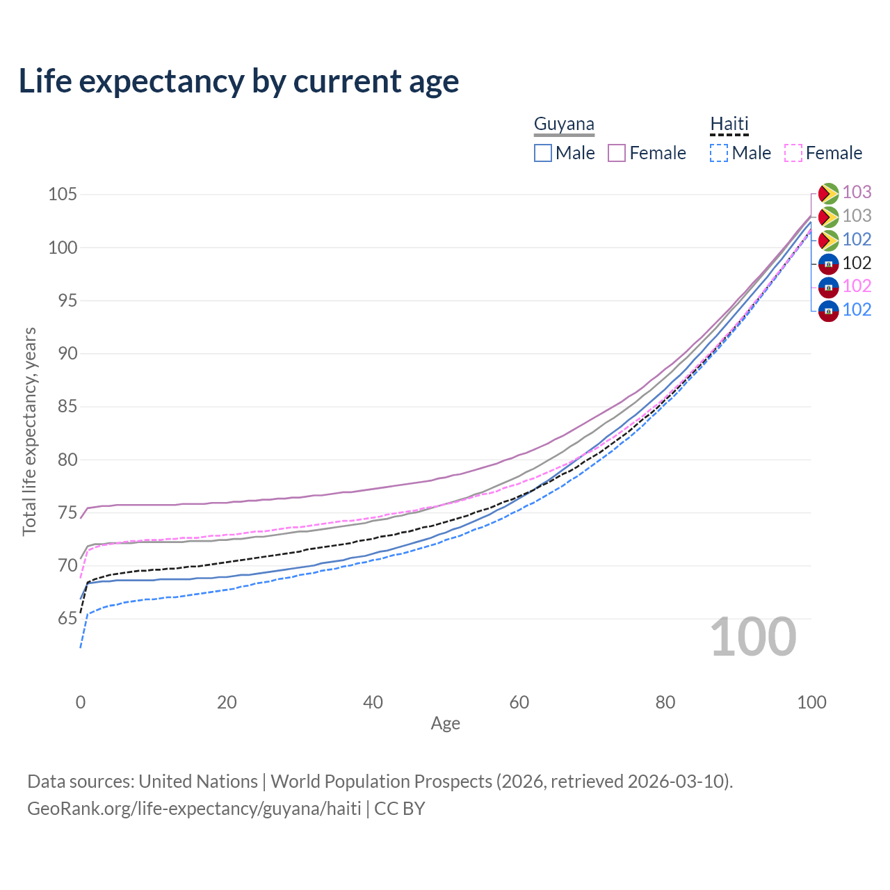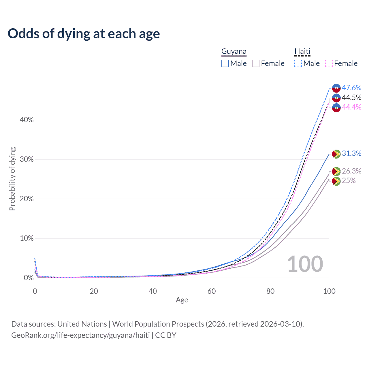 This life expectancy calculator shows the odds of living to 100, 95, 90, and below based on current age for both males and females in Guyana and Haiti, along with mean and median age of death. The calculations are based on the 2026 life tables (actuarial tables) from the UN World Population Prospects.