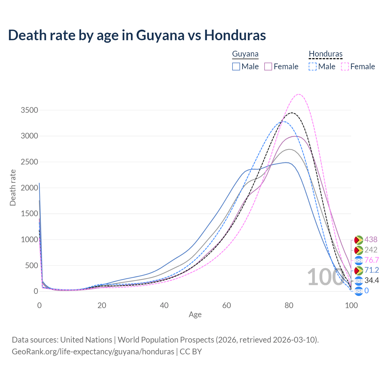In Guyana, the most common age of death is 80, compared to 81 in Honduras. The median age of death is 74.1 in Guyana and 77.1 in Honduras, meaning only half of each cohort is expected to live past that age.