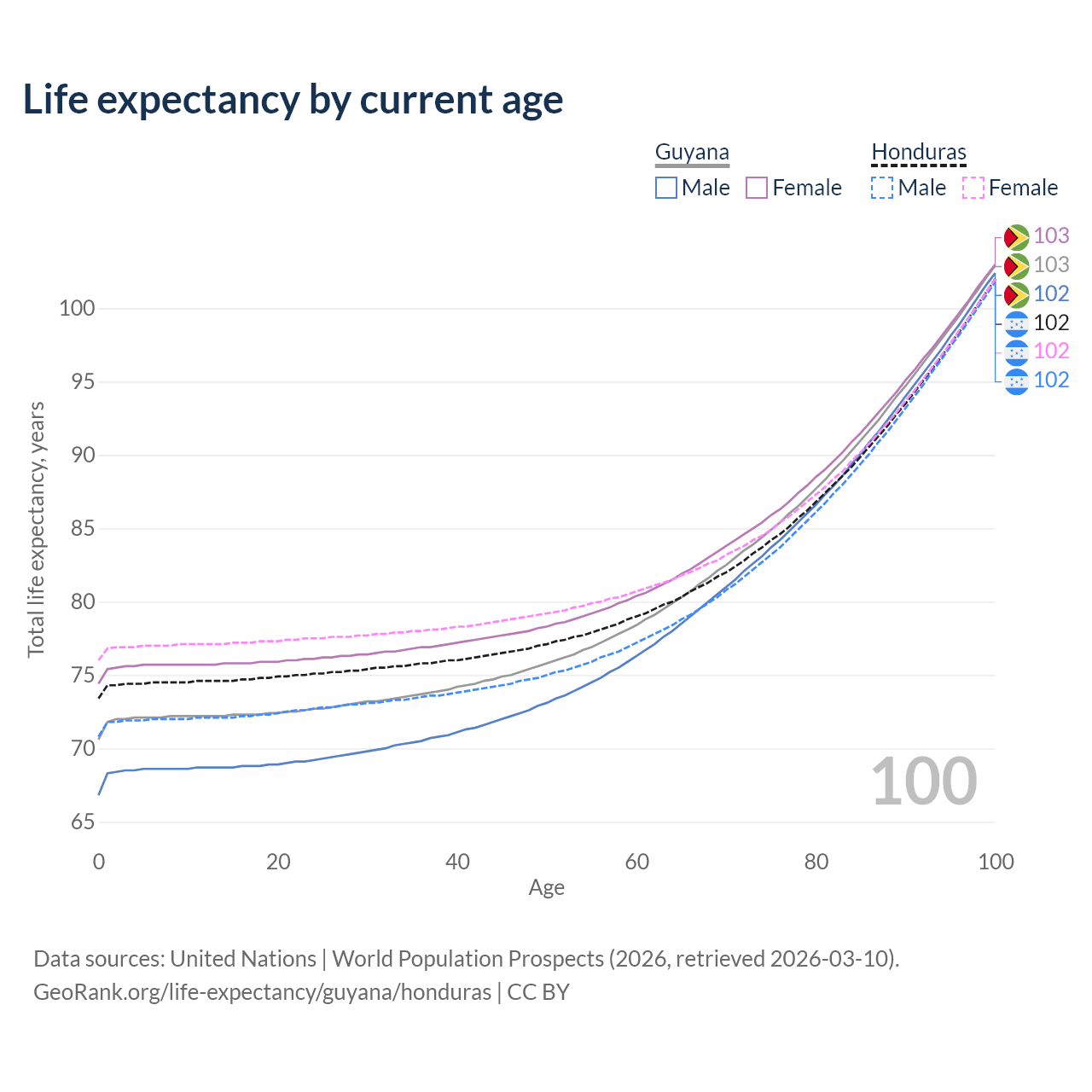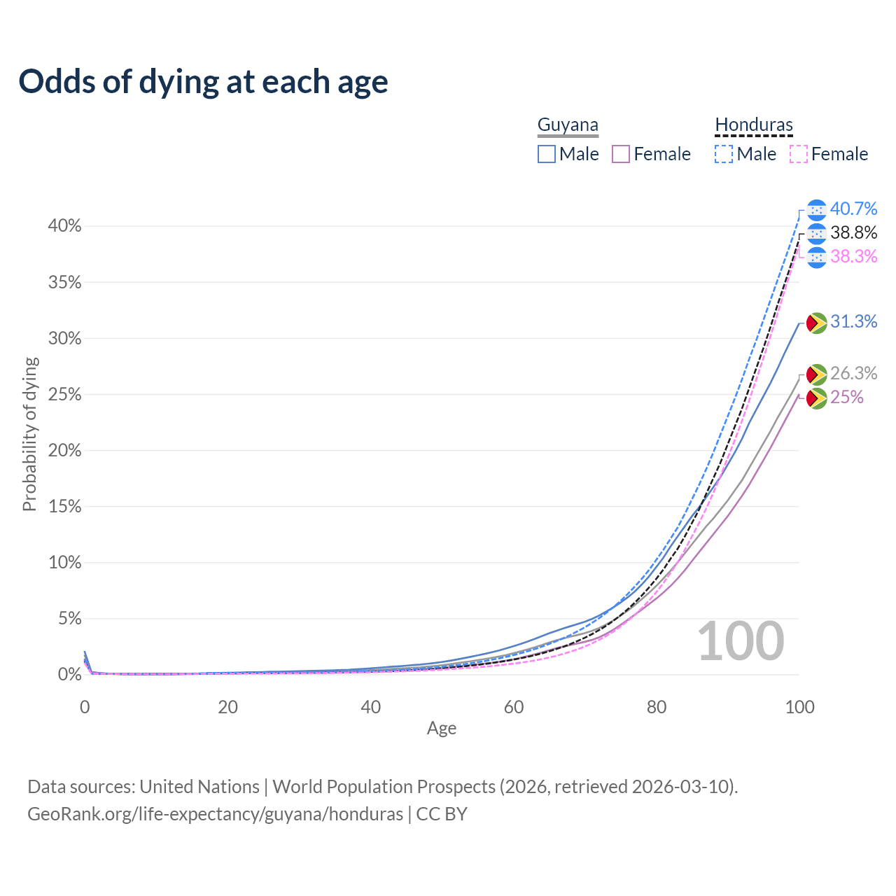 This life expectancy calculator shows the odds of living to 100, 95, 90, and below based on current age for both males and females in Guyana and Honduras, along with mean and median age of death. The calculations are based on the 2026 life tables (actuarial tables) from the UN World Population Prospects.