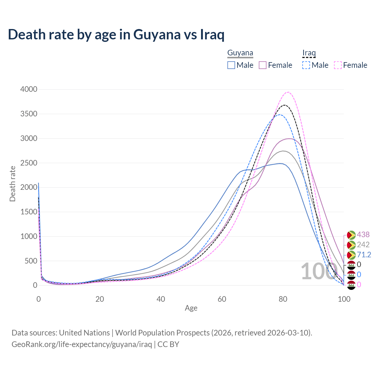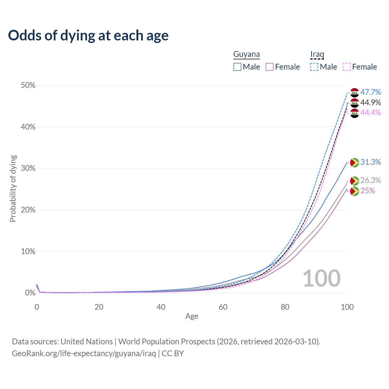 This life expectancy calculator shows the odds of living to 100, 95, 90, and below based on current age for both males and females in Guyana and Iraq, along with mean and median age of death. The calculations are based on the 2026 life tables (actuarial tables) from the UN World Population Prospects.
