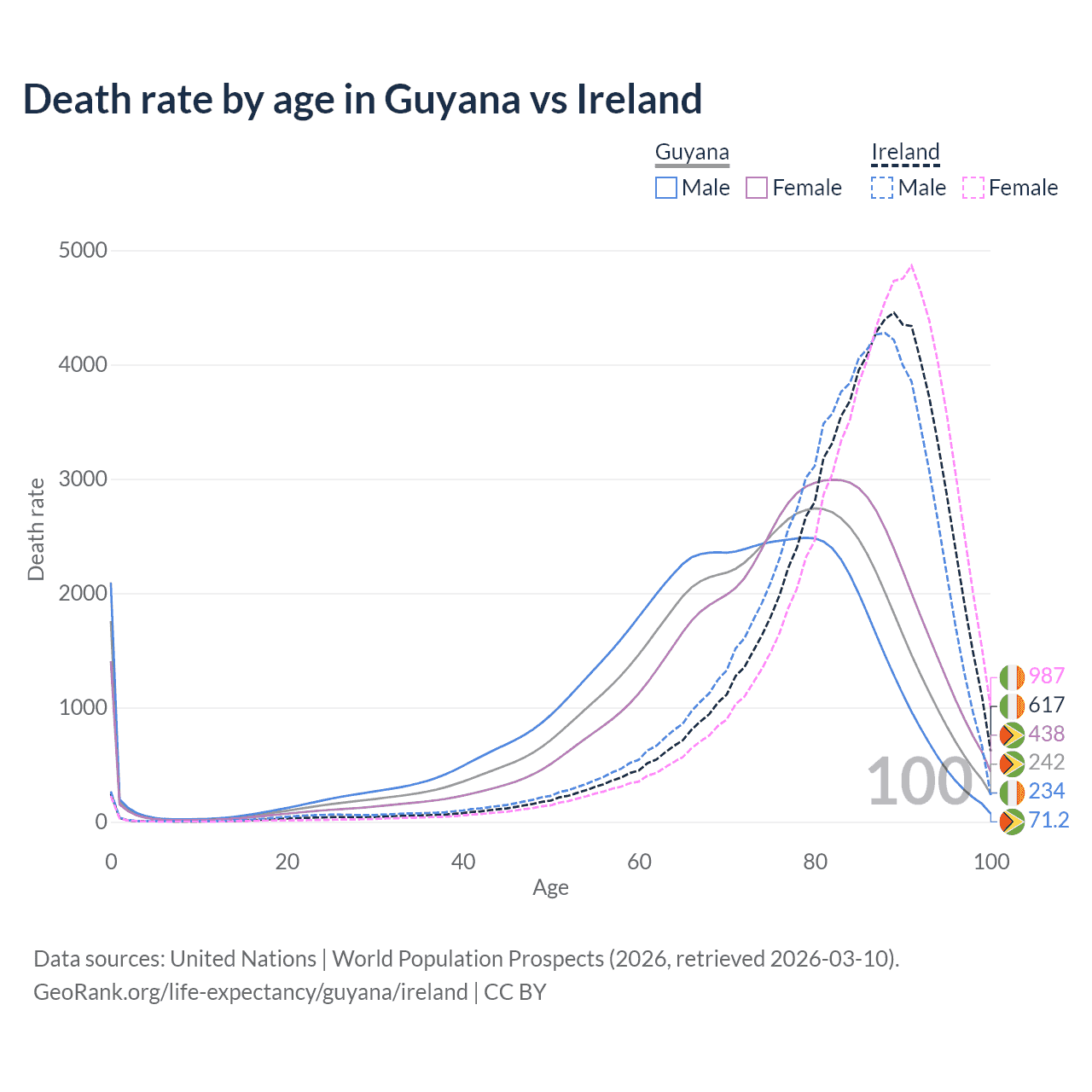 In Guyana, the most common age of death is 80, compared to 89 in Ireland. The median age of death is 74.1 in Guyana and 85.7 in Ireland, meaning only half of each cohort is expected to live past that age.