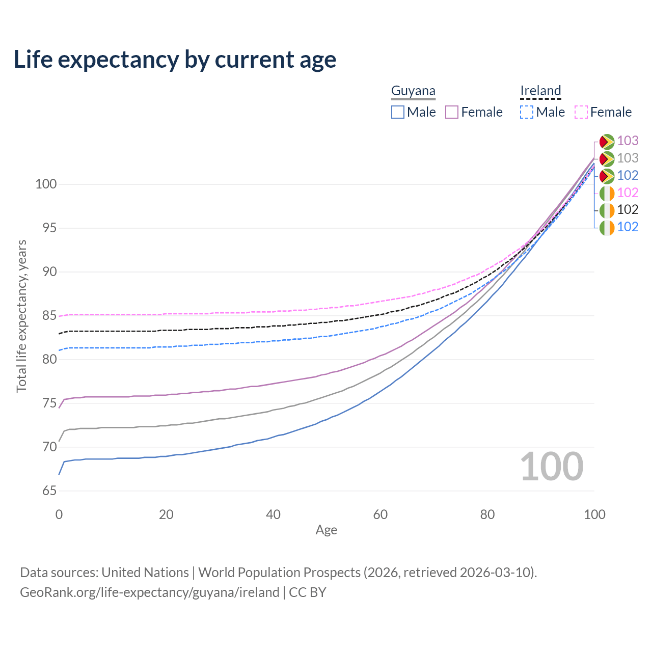 This life expectancy calculator shows the odds of living to 100, 95, 90, and below based on current age for both males and females in Guyana and Ireland, along with mean and median age of death. The calculations are based on the 2026 life tables (actuarial tables) from the UN World Population Prospects.