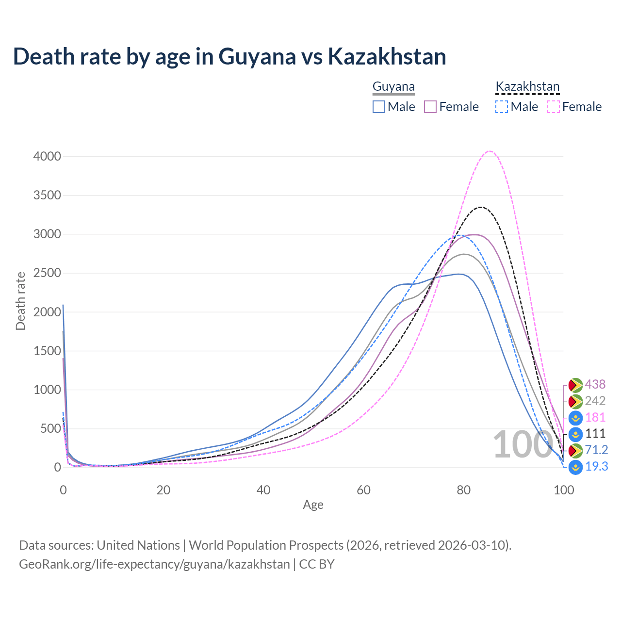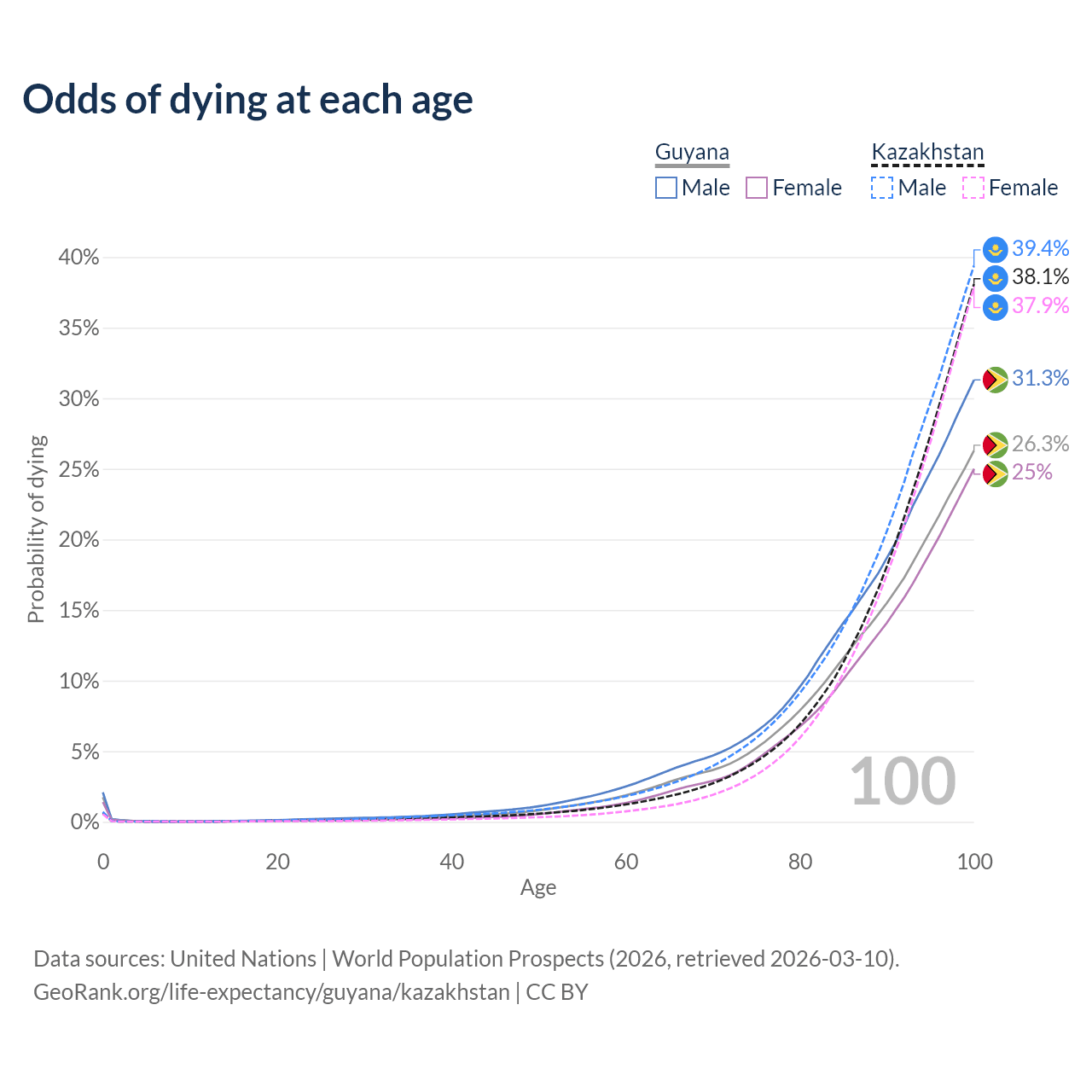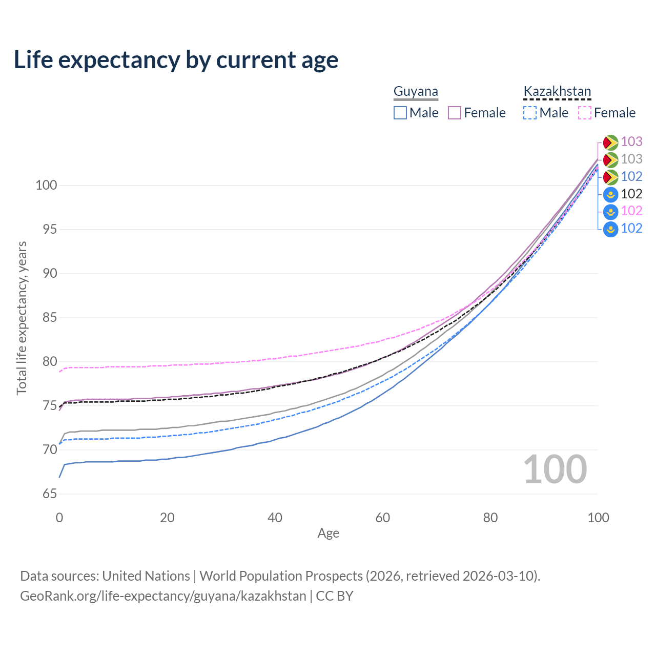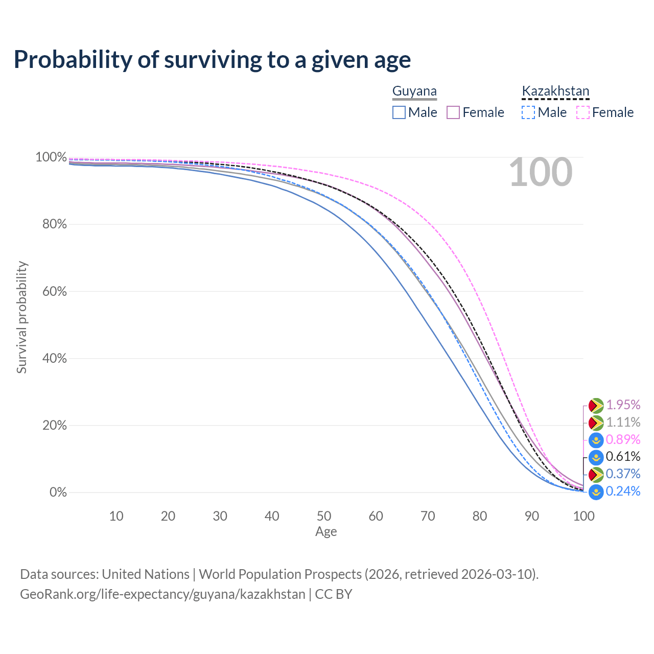 This life expectancy calculator shows the odds of living to 100, 95, 90, and below based on current age for both males and females in Guyana and Kazakhstan, along with mean and median age of death. The calculations are based on the 2026 life tables (actuarial tables) from the UN World Population Prospects.
