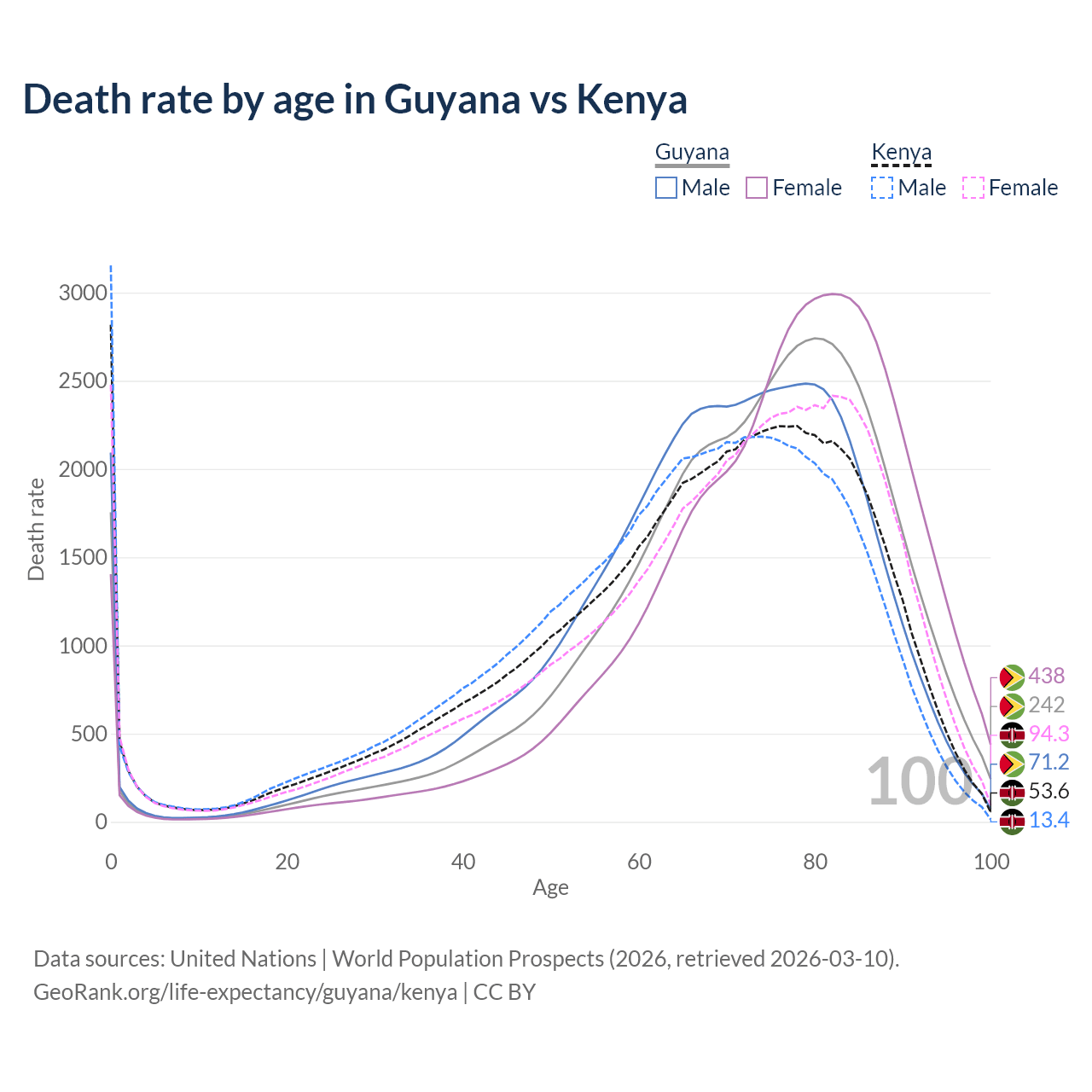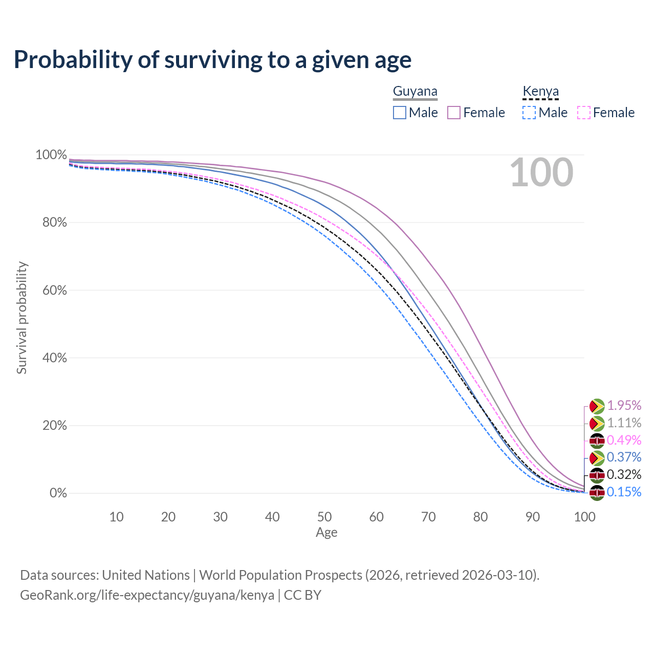 This life expectancy calculator shows the odds of living to 100, 95, 90, and below based on current age for both males and females in Guyana and Kenya, along with mean and median age of death. The calculations are based on the 2026 life tables (actuarial tables) from the UN World Population Prospects.