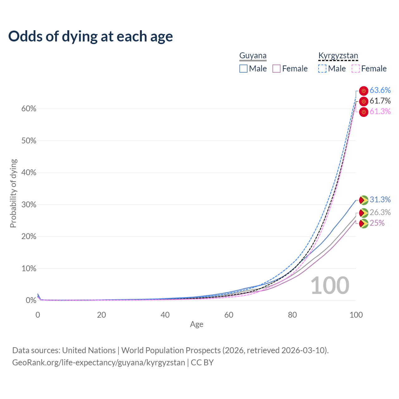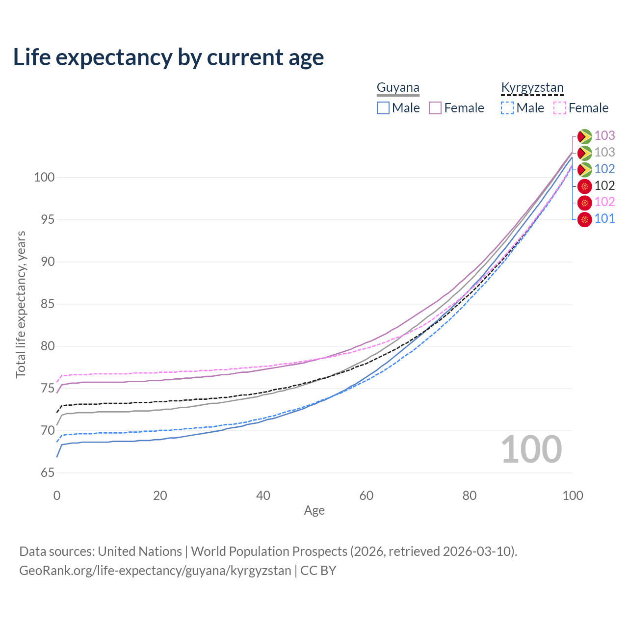 This life expectancy calculator shows the odds of living to 100, 95, 90, and below based on current age for both males and females in Guyana and Kyrgyzstan, along with mean and median age of death. The calculations are based on the 2026 life tables (actuarial tables) from the UN World Population Prospects.