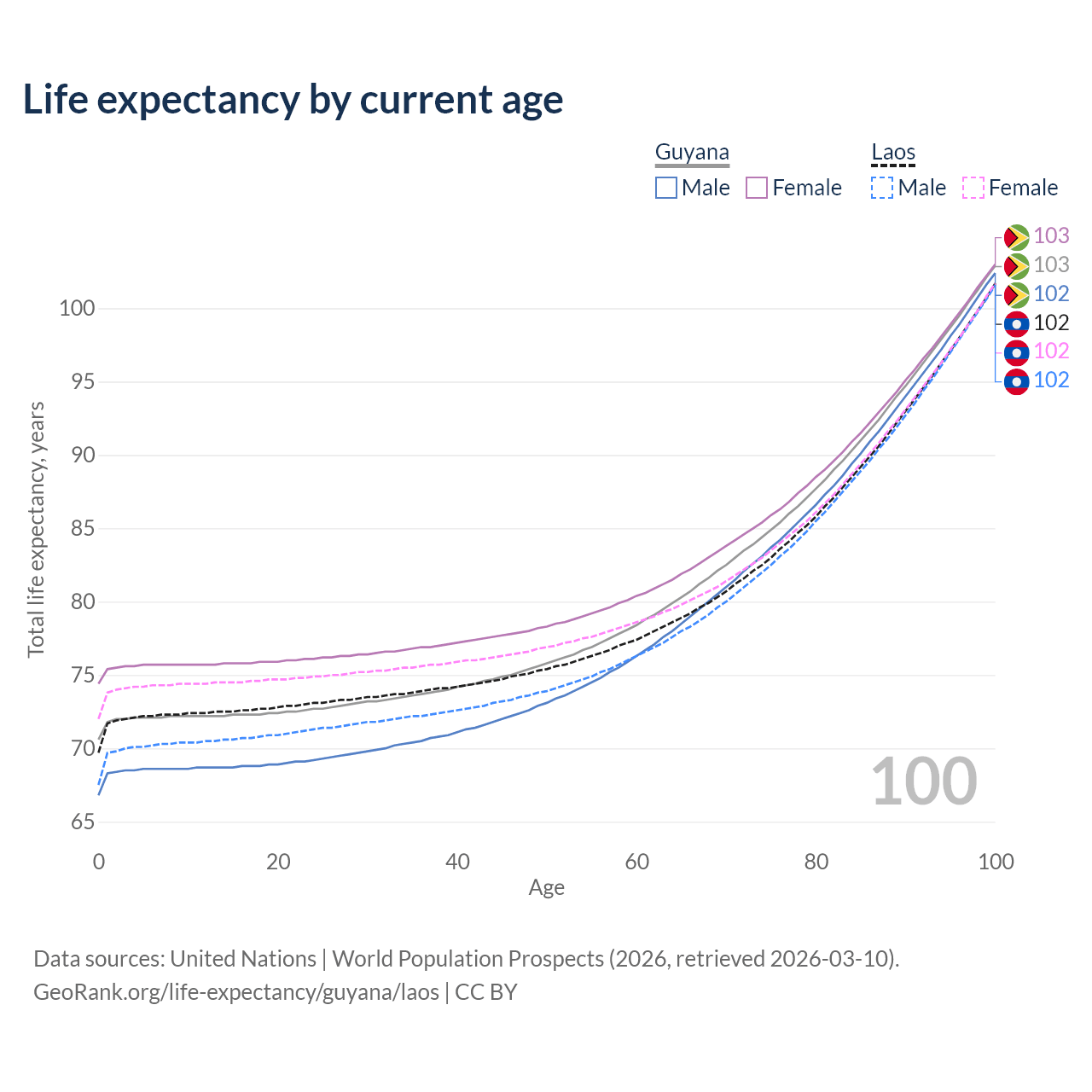 This life expectancy calculator shows the odds of living to 100, 95, 90, and below based on current age for both males and females in Guyana and Laos, along with mean and median age of death. The calculations are based on the 2026 life tables (actuarial tables) from the UN World Population Prospects.