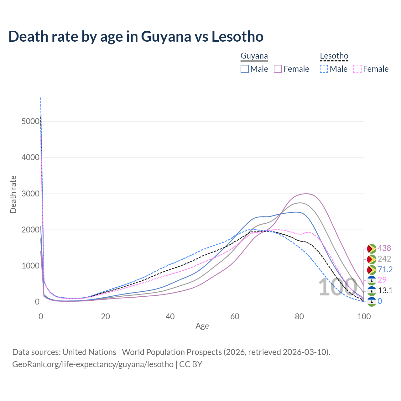In Guyana, the most common age of death is 80, compared to 0 in Lesotho. The median age of death is 74.1 in Guyana and 63.4 in Lesotho, meaning only half of each cohort is expected to live past that age.
