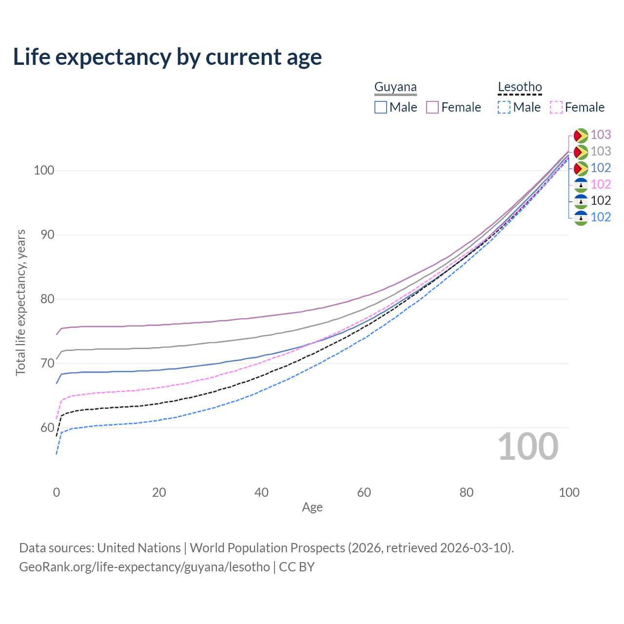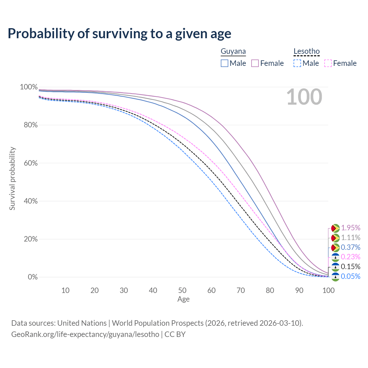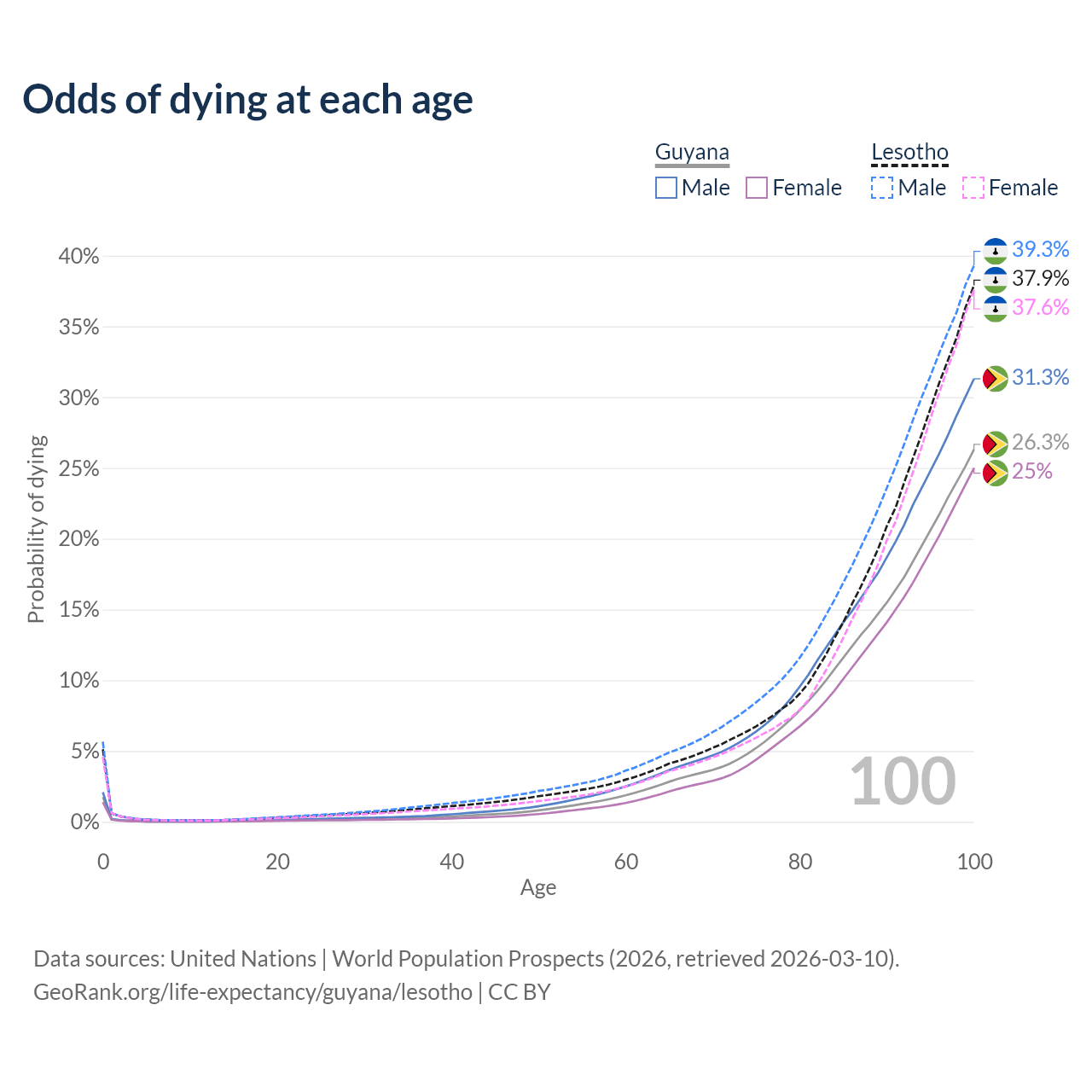 This life expectancy calculator shows the odds of living to 100, 95, 90, and below based on current age for both males and females in Guyana and Lesotho, along with mean and median age of death. The calculations are based on the 2026 life tables (actuarial tables) from the UN World Population Prospects.