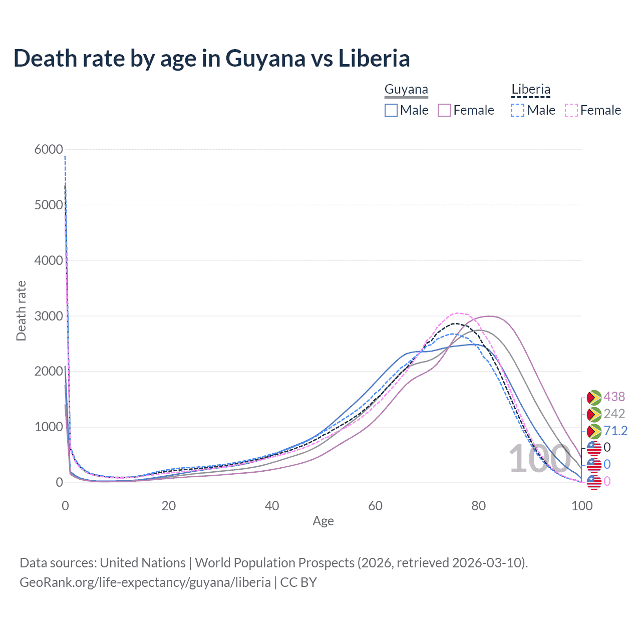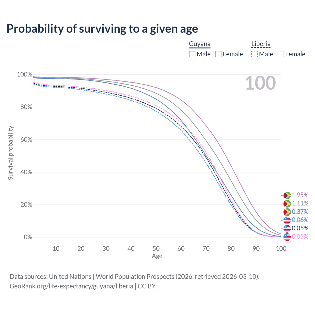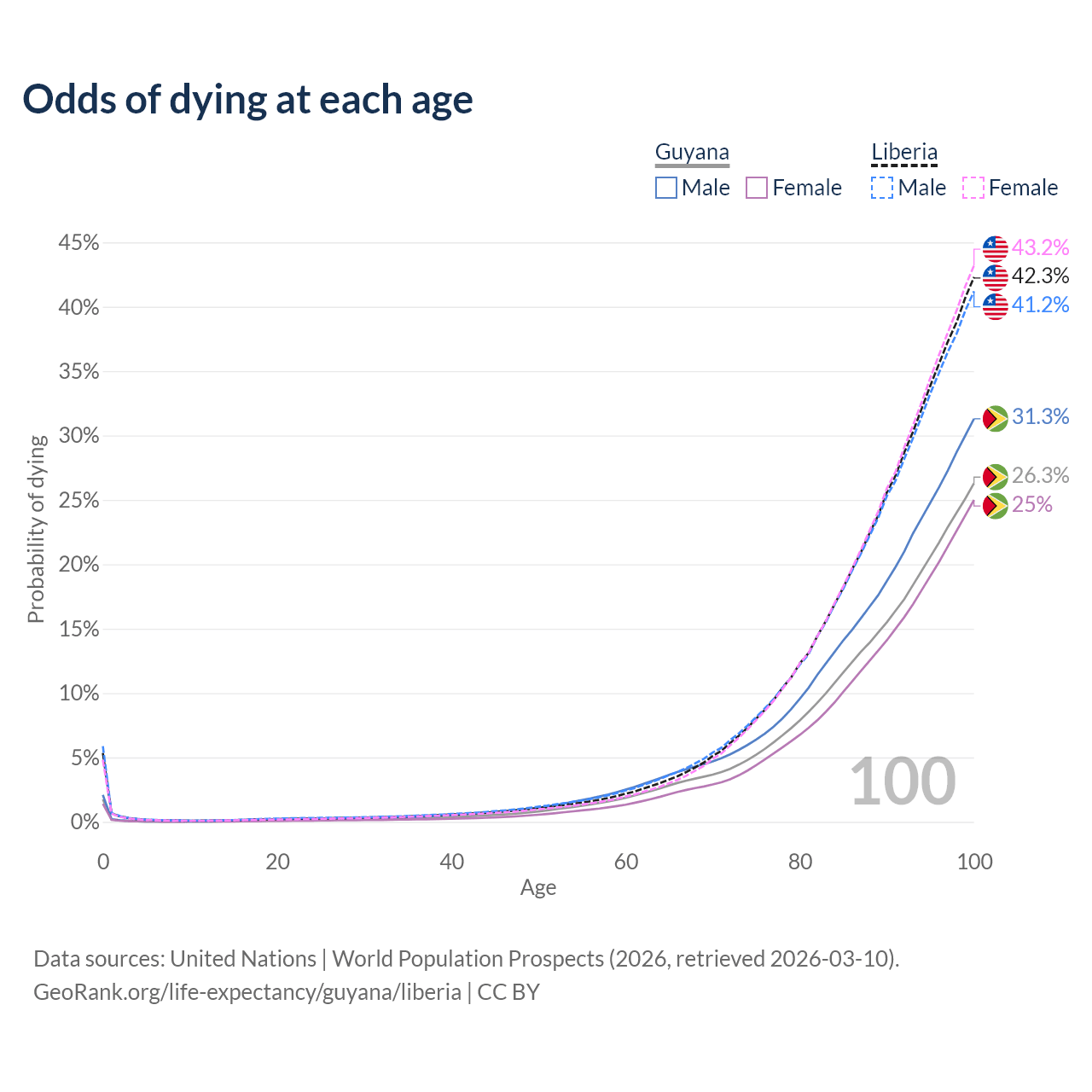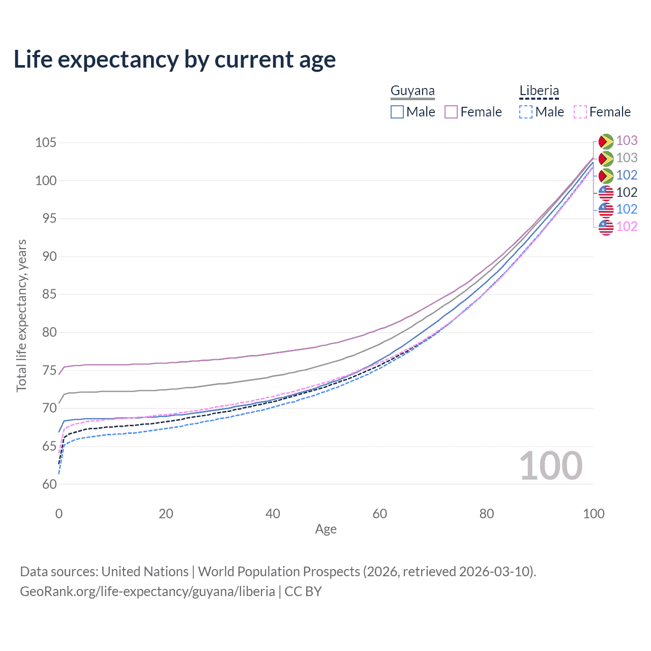 This life expectancy calculator shows the odds of living to 100, 95, 90, and below based on current age for both males and females in Guyana and Liberia, along with mean and median age of death. The calculations are based on the 2026 life tables (actuarial tables) from the UN World Population Prospects.