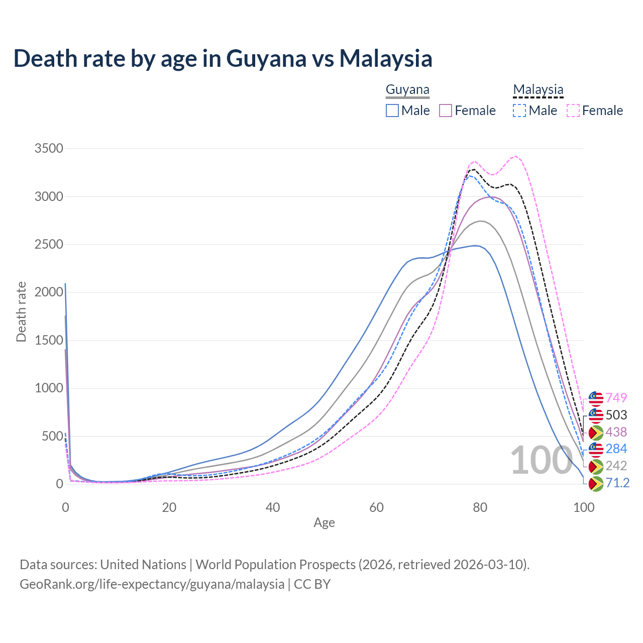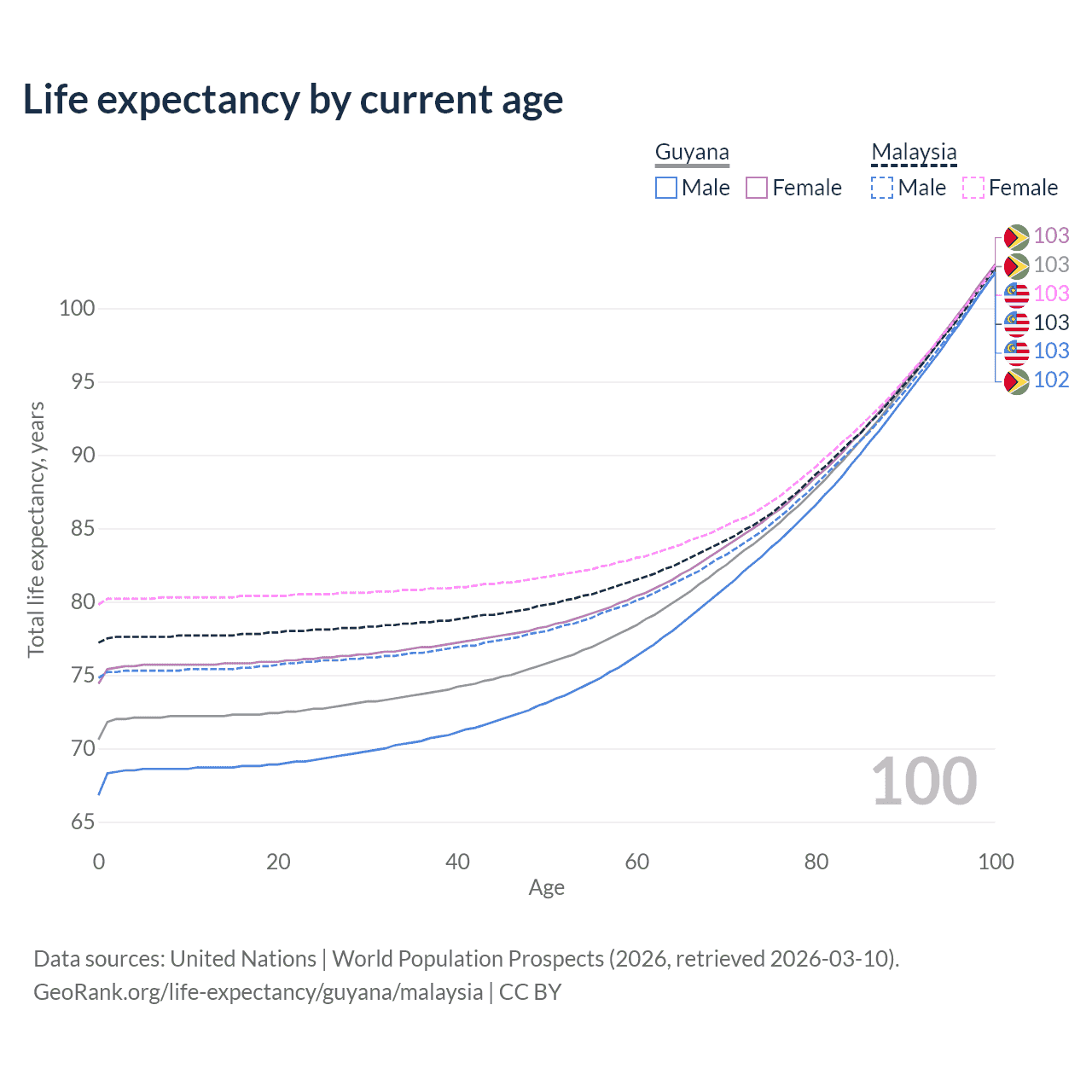 This life expectancy calculator shows the odds of living to 100, 95, 90, and below based on current age for both males and females in Guyana and Malaysia, along with mean and median age of death. The calculations are based on the 2026 life tables (actuarial tables) from the UN World Population Prospects.